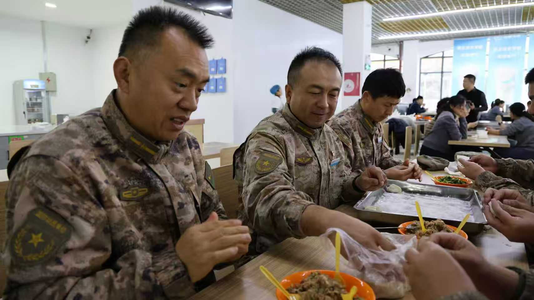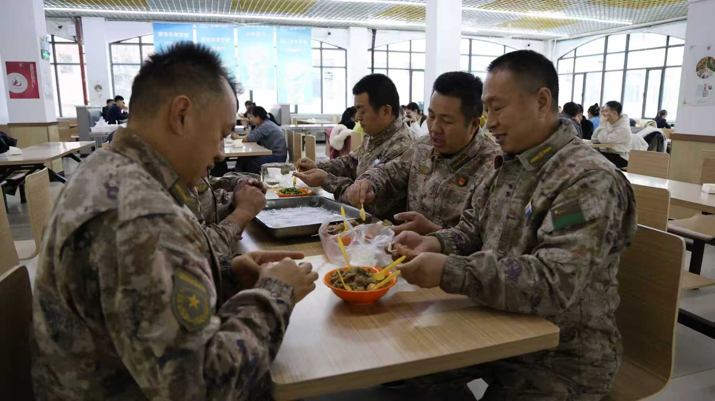 活动现场,教官们化身“巧厨匠”,分工协作、默契配合、有条不紊,捏、挤、折手法娴熟,一个个饱满的饺子很快摆满托盘。大家围在一起话家常、聊工作,分享带兵心得与冬至民俗,现场洋溢着温馨热闹的氛围。