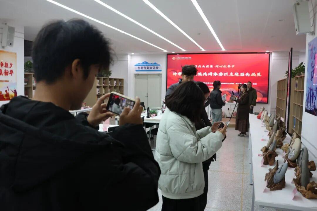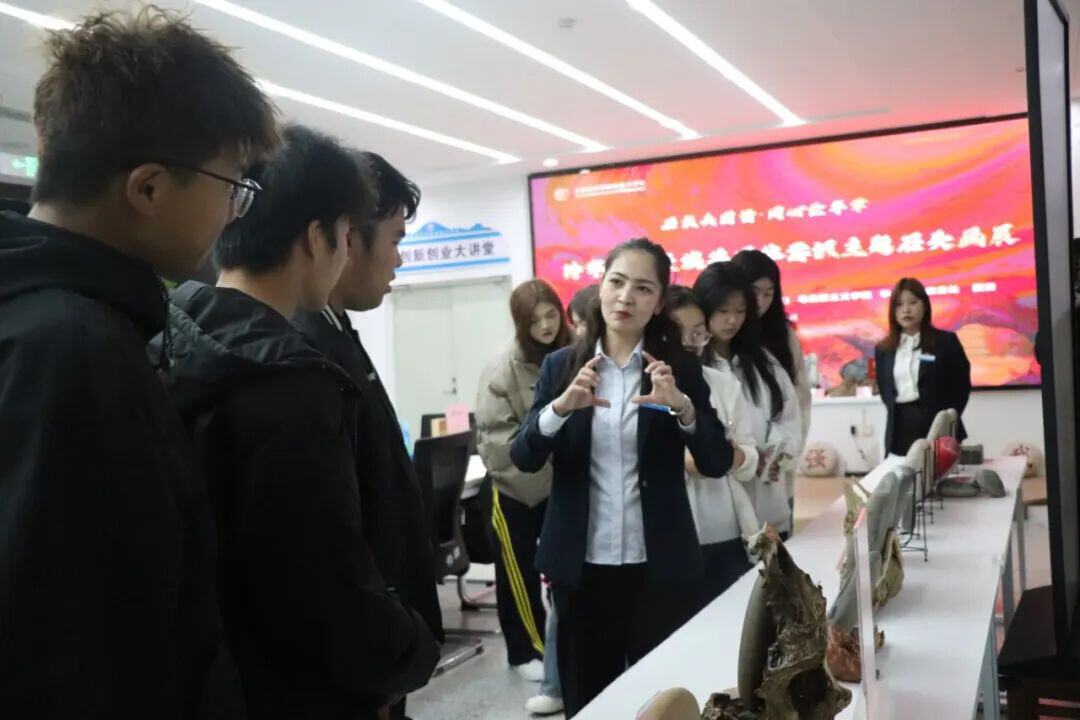 10月18日,展览现场同步开展沉浸式思政实践课——第六期青年马克思主义者培养班100名学员齐聚展厅,以石为媒、以艺为桥,在历史与艺术的对话中重温峥嵘岁月。学校团委负责人黎丽、教师苗梦雪结合石河子变迁主线,通过石头画背后的真实故事,将抽象的兵团精神具象化。学校党委书记史文革现场与学员交流,寄语大家以观展为新起点,将精神力量转化为成长动力,为兵团发展与学校建设贡献青春力量。