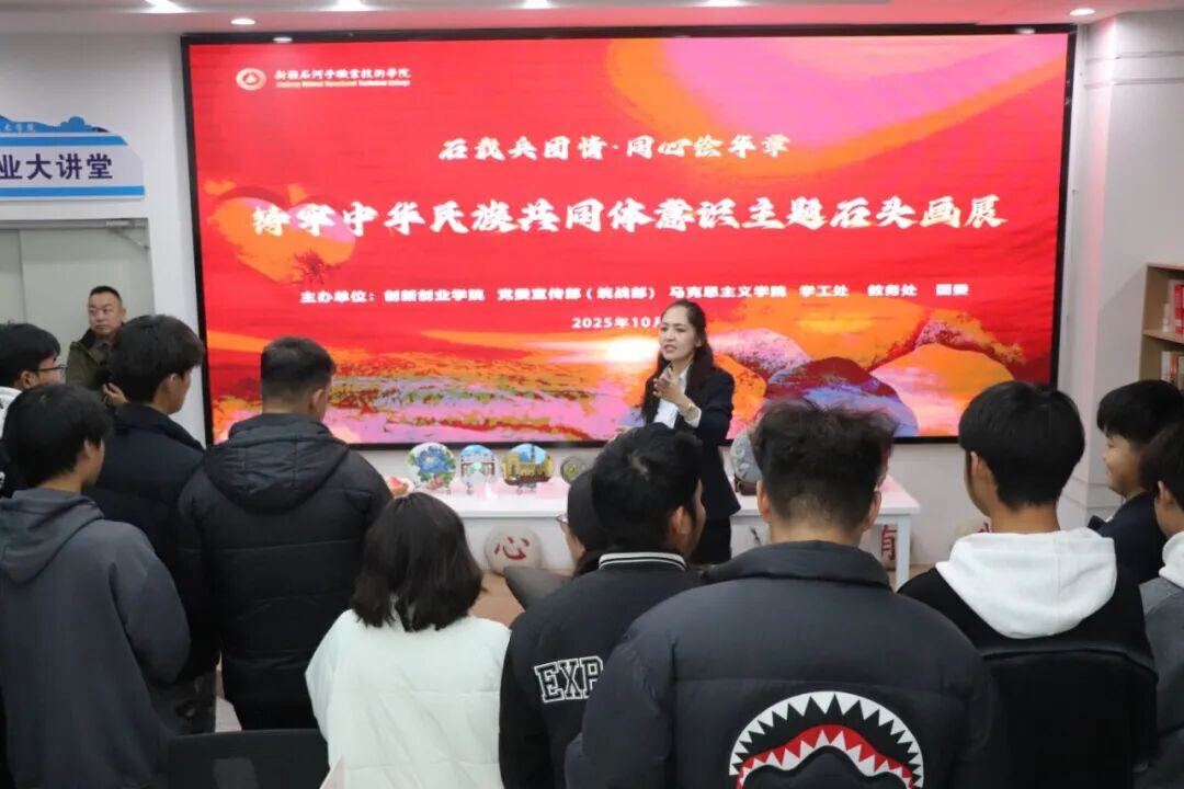 近日,新疆石河子职业技术学院以“石载兵团情・同心绘华章”主题石头画展为载体,创新融合展览育人、课堂教学、实践体验等多元场景,将“四维六融四行”思政教学模式深度落地,构建沉浸式思政育人新范式。