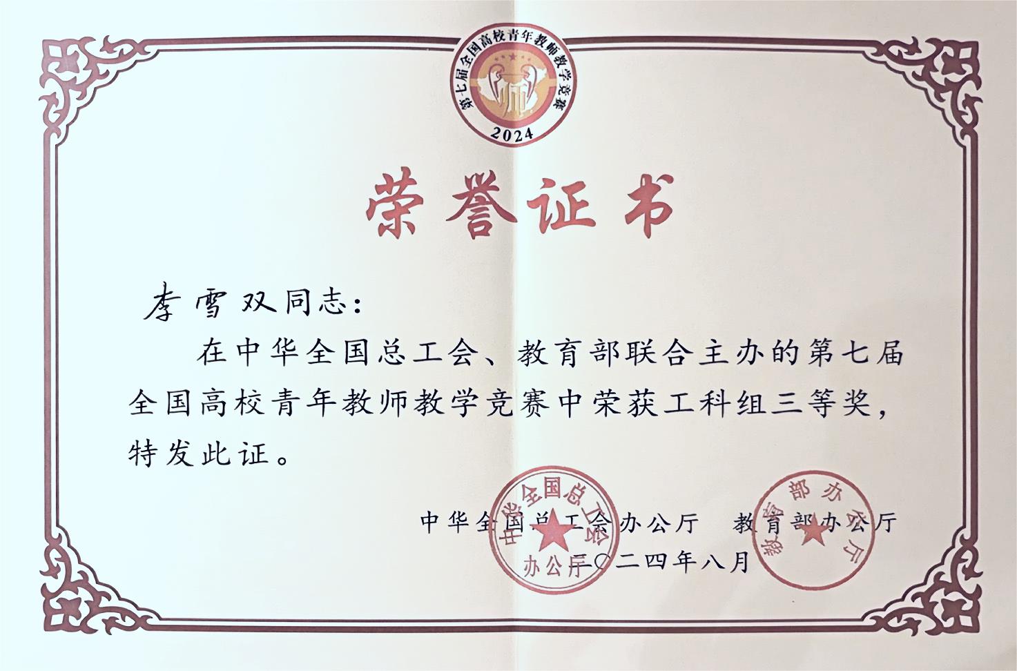 (王需 杨慧 报道)2024年8月26日至30日,第七届全国高校青年教师教学竞赛决赛在上海交通大学圆满落幕。来自130所学校的159名选手同台竞技,新疆石河子职业技术学院水利建筑工程学院教师李雪双荣获工科组三等奖。