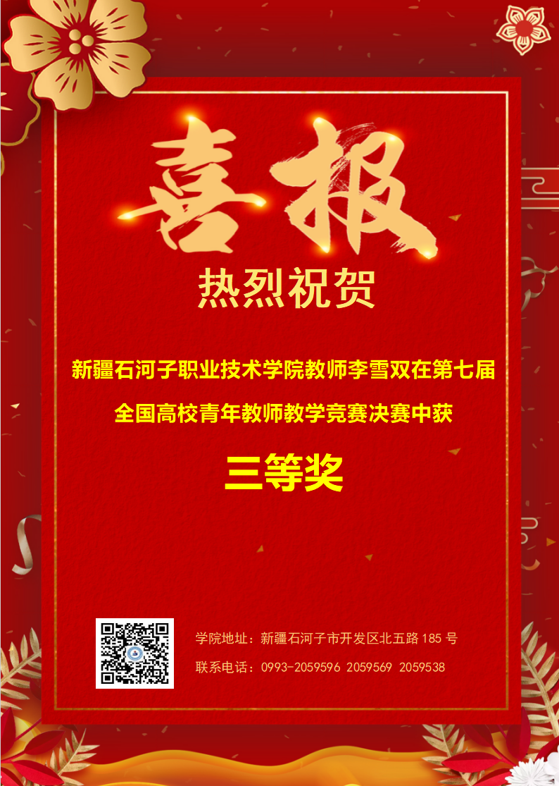 李雪双老师在今年4月份举行的第三届兵团高校青年教师教学竞赛中获得工科组一等奖,被兵团总工会、兵团教育局推荐参加全国高校青年教师教学竞赛。青年教师教学竞赛由中华总工会、教育部主办,以“上好一门课”为竞赛理念,是全国参与面最广、影响力最大、组织规模最大、要求最严格的全国性高水平教学类竞赛,被誉为高等教育界的“全运会”,设文科、理科、工科、医科和思想政治课专项五个组别。本次是学院首次派出教师参赛,实现了学校在此类全国性教学竞赛中获奖零的突破。
