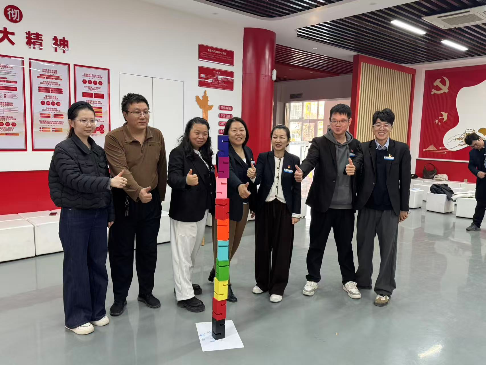 活动中,“拼图寻队”破冰环节迅速凝聚团队,教师们按拼图颜色、数字组队,8人一组完成拼图并确定队名口号;“长征精神”主题研讨环节,教师们围绕长征攻坚精神与教师学术、教学、育人工作的契合点头脑风暴,结合食品工程专业实际,从课程思政、科研攻关、育人实践等角度深入交流,形成在专业课程设“长征式”项目任务等行动策略,各组分享展现对长征精神的深刻领悟;合力建塔游戏中,教师们协作拉绳搭建模型,通过默契沟通分工,完成任务获胜利,锤炼了协作能力;“重走长征路”游戏里,教师们齐心协力让小球沿长征路线前进,掉落时喊口号重回节点,在尝试中体会长征百折不挠的精神内核。活动尾声,全体教师齐唱《没有共产党就没有新中国》,激昂歌声传递“党旗下育人、初心永传承”的信念。