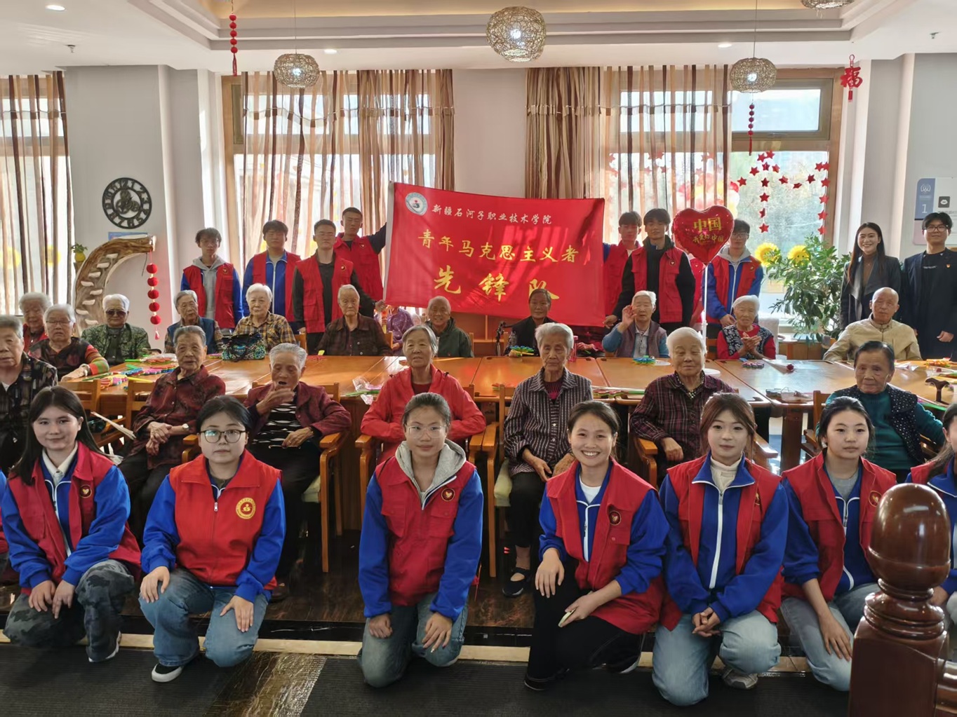(郭同贺 报道)2025年10月27日,重阳佳节来临之际,新疆石河子职业技术学院团委为弘扬中华民族尊老、敬老、爱老的传统美德,践行志愿服务精神,组织第六期青马学员代表前往盛世银龄长者公寓,开展“青春暖夕阳”志愿服务活动。学员们带着青春的活力与真诚的关怀,为老人们送上了重阳节日的祝福。