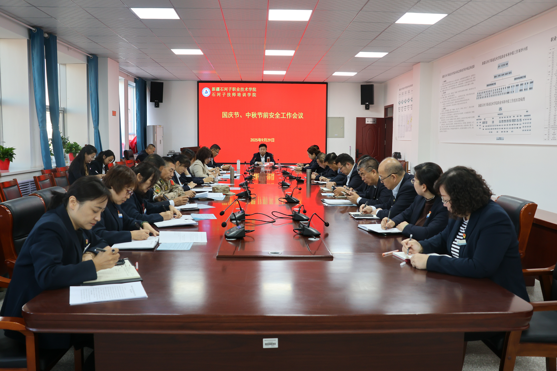 (徐千然 报道)为确保全校师生度过一个平安、祥和、愉快的国庆节与中秋节假期,筑牢校园安全防线,2025年9月29日,新疆石河子职业技术学院召开国庆节、中秋节前安全工作会议。会议由新疆石河子职业技术学院院长林炯主持,学校纪委书记万祥军,副院长马彩梅、张金果,各二级学院领导及相关部门负责人参加会议。