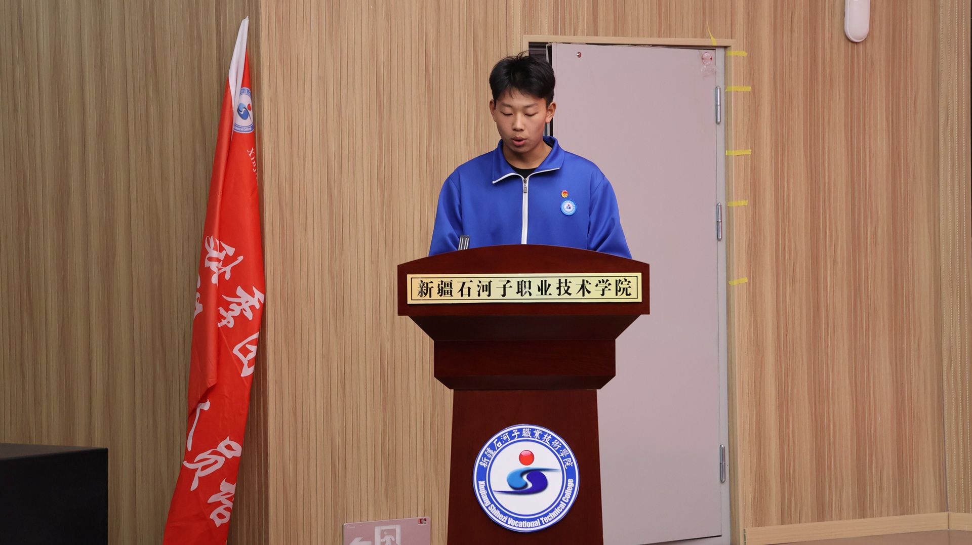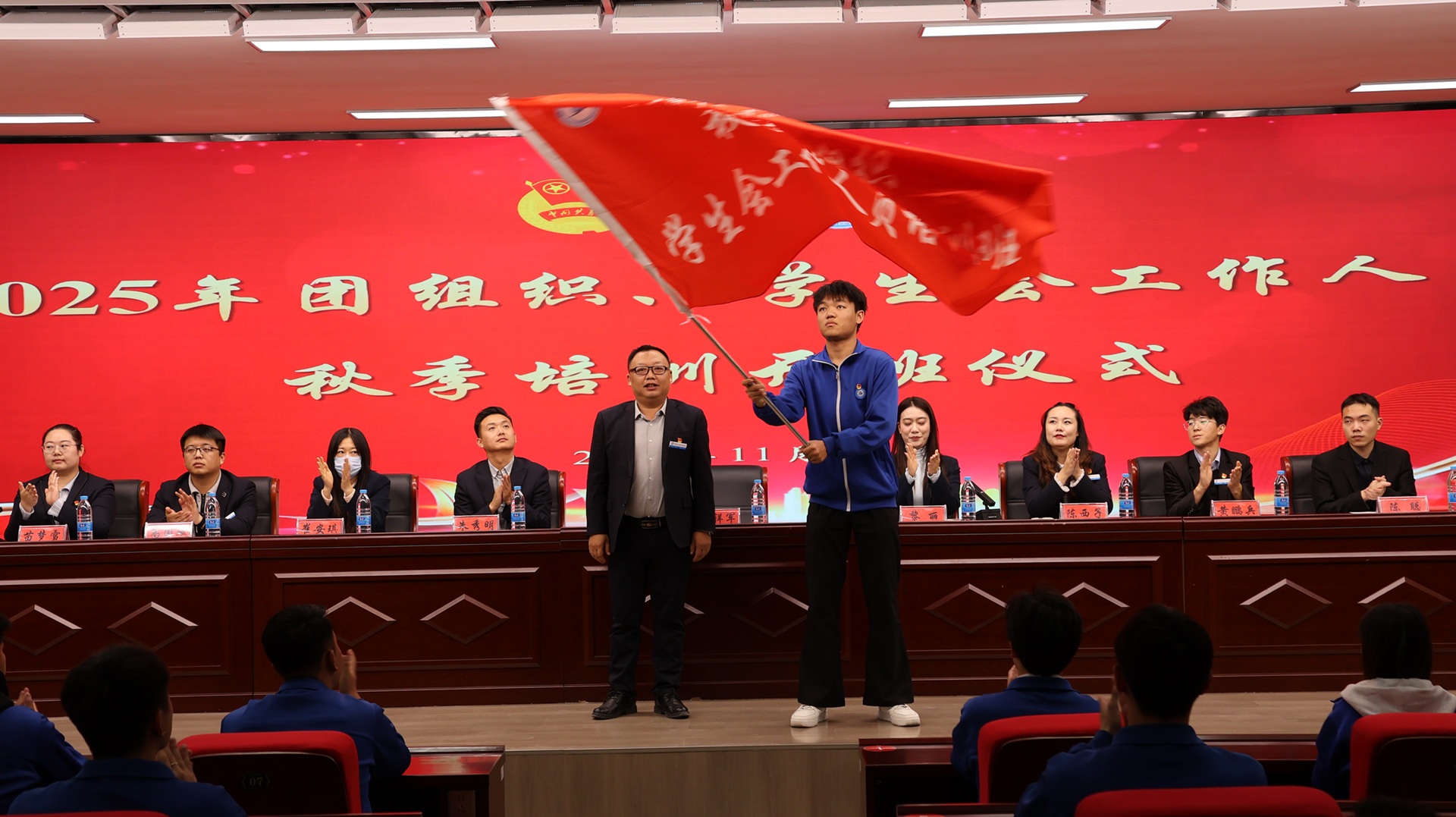 仪式最后,学院领导为本次培训班授旗。鲜红的旗帜象征着团员的责任与使命,更为全体参训团员注入了砥砺奋进的强大动力。此次开班仪式的顺利举行,为后续培训工作奠定了基础,全体团员将以本次培训为新起点,在学思践悟中坚定理想信念,在服务奉献中锤炼真才实学,以实际行动践行青年担当。