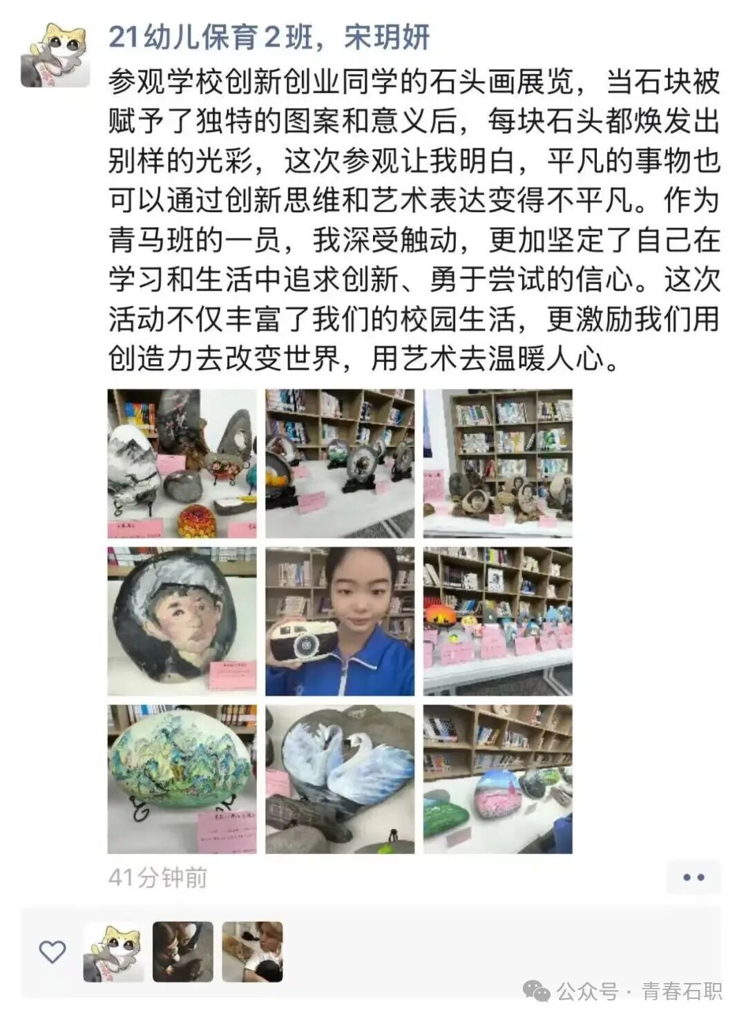 当冰冷的玛河顽石邂逅滚烫的兵团精神,当艺术的笔触勾勒历史的年轮,一堂浸润心灵的思政实践课在创新创业学院悄然开启。2025年10月17日,新疆石河子职业技术学院第六期青年马克思主义者培养班的100名学员齐聚“石载兵团情・同心绘华章”主题石头画展览现场,以石为媒、以艺为桥,在历史与艺术的交汇处重温峥嵘岁月,感悟新时代青年的使命担当。
