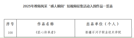 (杨慧 赵亚男报道)新疆石河子职业技术学院精心选送的作品《匠心传承者》成功入选由教育部教师工作司、中国教育电视台等单位联合主办的2025年教师风采“感人瞬间”短视频征集活动全国100部入围作品名单,为学院职业教育育人成果再添光彩!