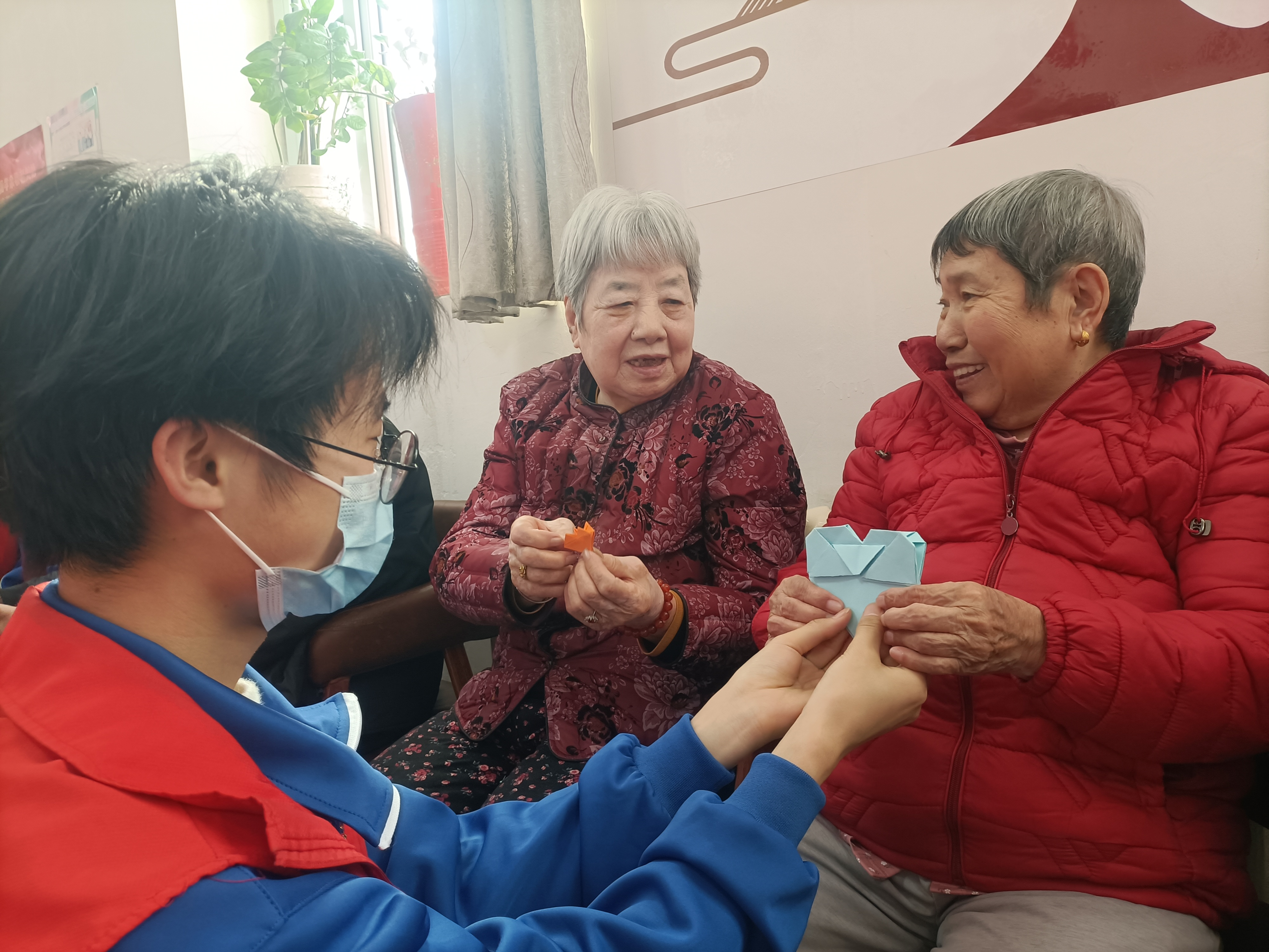 活动中,志愿者们围坐在老人身边,“奶奶,您最近身体怎么样?”“爷爷,这儿住得还习惯吗?”一句句贴心的问候,细致地询问着老人们的身体状况与日常起居,真诚的陪伴让养老院里洋溢着温暖的气息。文艺表演环节,志愿者们倾情献唱《映山红》《如愿》等经典歌曲,熟悉的旋律唤起老人们的青春记忆,不少人情不自禁地跟着轻轻哼唱;诗朗诵《年轻的城》更是以真挚的情感、铿锵的韵律,赢得了老人们的阵阵掌声,歌声与诵读声交织,为平日宁静的养老院增添了青春的活力。在手工折纸区,志愿者们手把手地教老人折纸鹤、纸花,老人们看着饱含心意的折纸,绽放出笑容。在扭秧歌环节,伴随着欢快的节奏,志愿者与老人们携手舞动,现场氛围其乐融融。志愿者们还充分发挥专业特长,为老人们精心准备了食品安全宣讲和预防电信诈骗宣传。他们用通俗易懂的语言,结合生活中的实例,耐心讲解食品安全注意事项,剖析电信诈骗的常见套路,切实帮助老人们提升健康意识和自我保护能力。