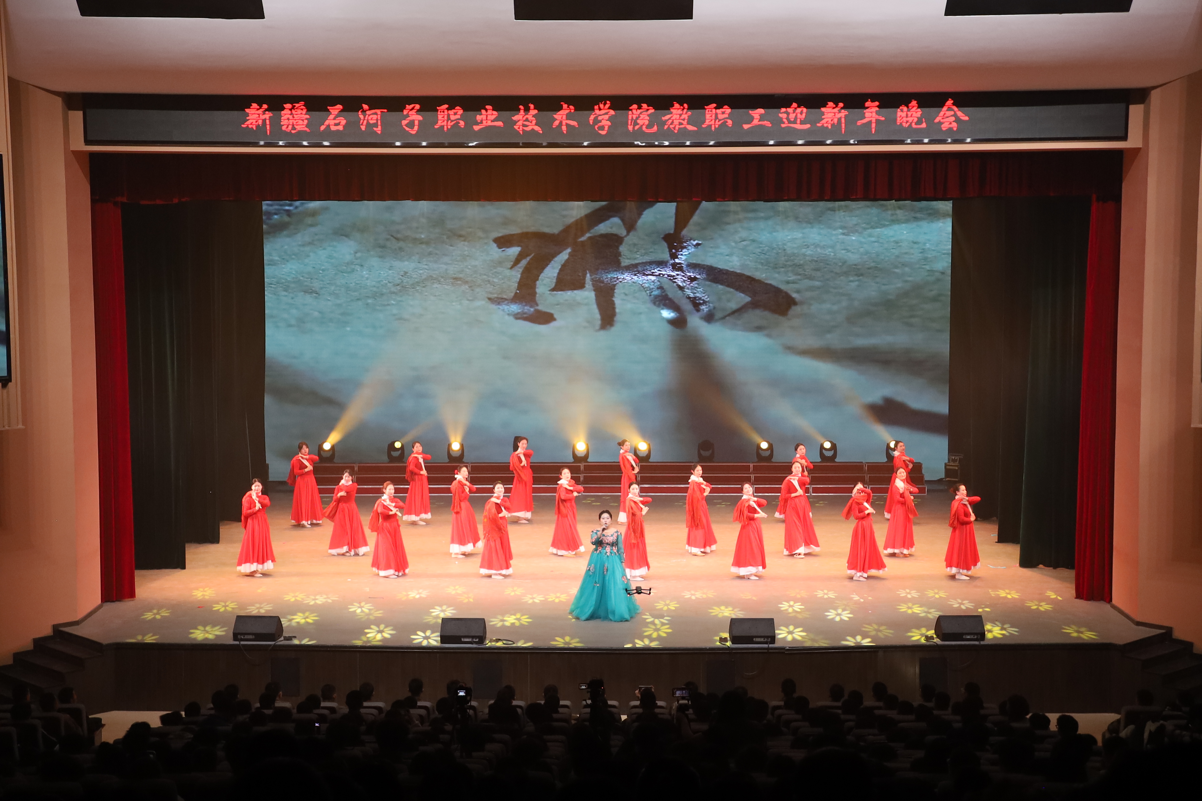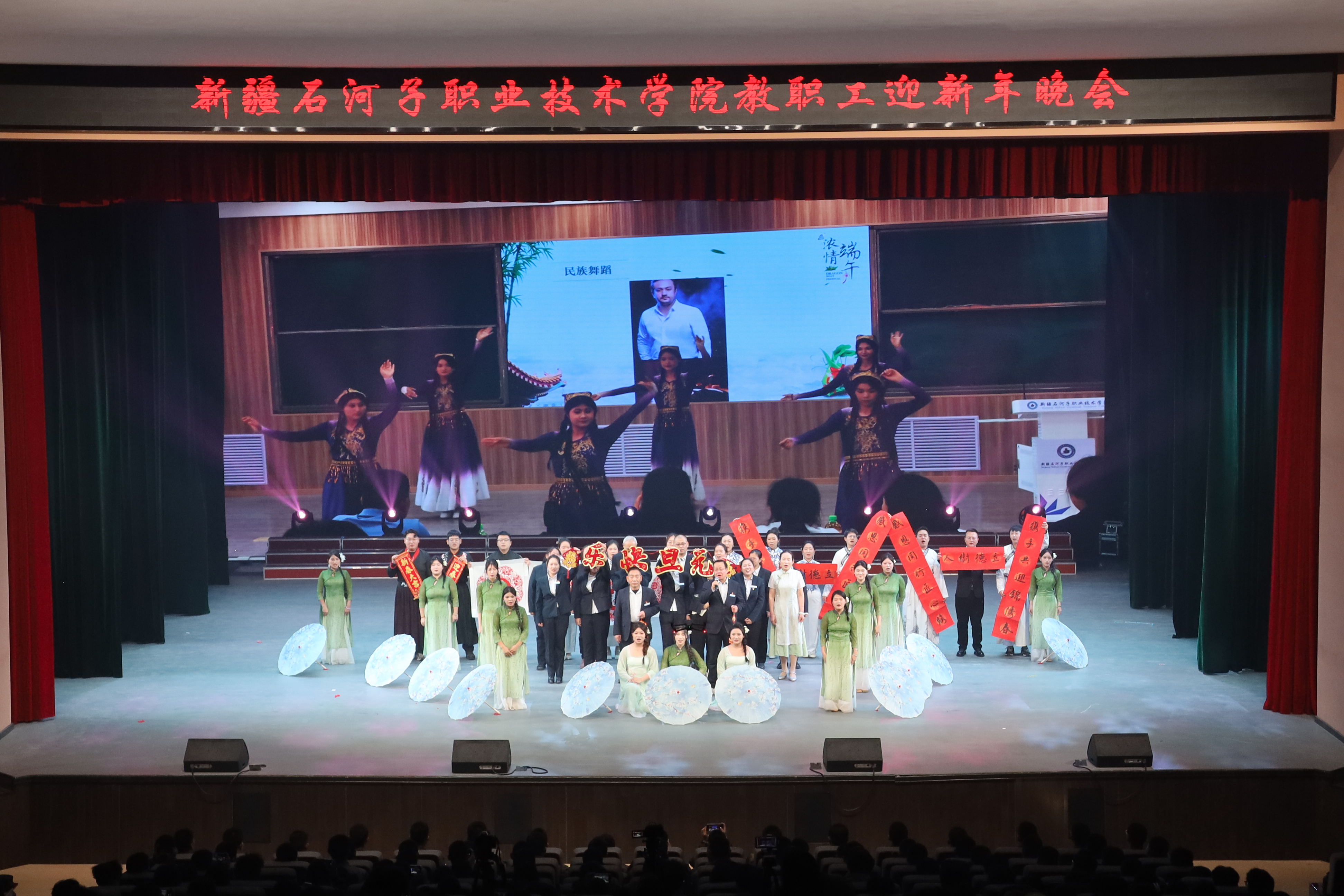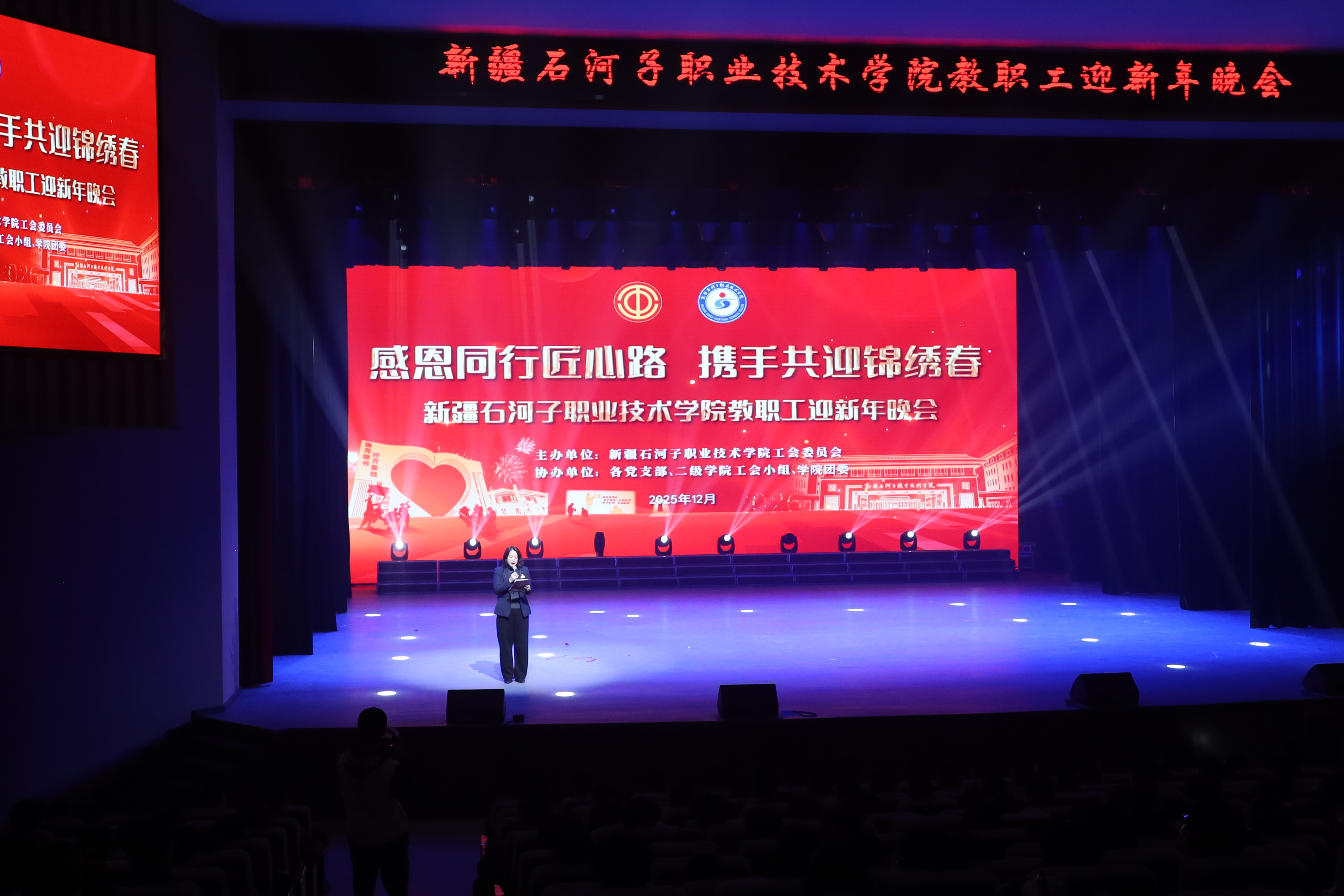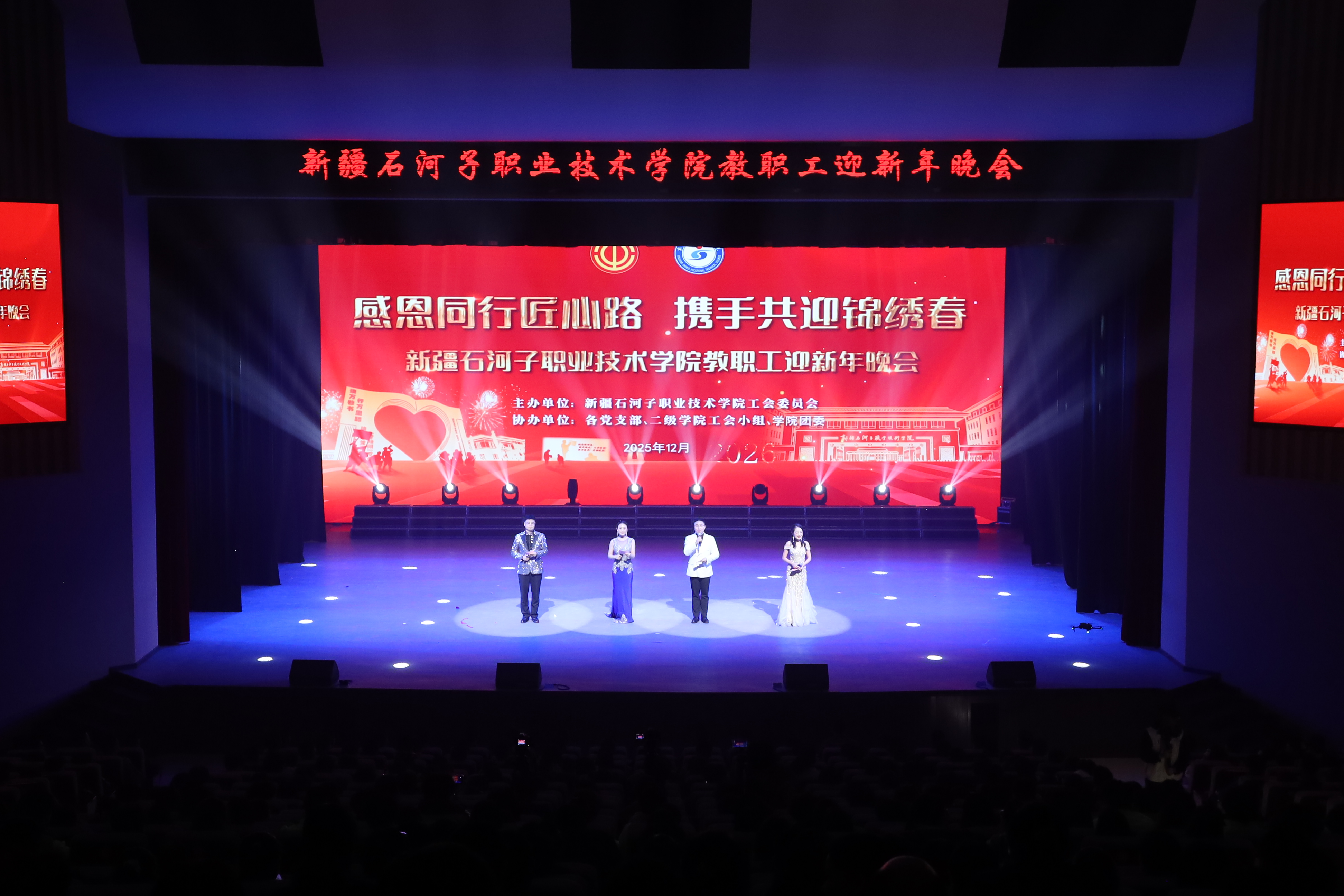 雪域天山迎师友,戈壁教坛庆团圆。2025年12月29日,新疆石河子职业技术学院以“感恩同行匠心路,携手共迎锦绣春”为主题,在学术报告厅举行2025年教职工迎新年晚会。学校党委书记史文革携班子成员,与全体教职工、学生代表1000余人欢聚一堂,共话教育初心,共庆盛世新年。
