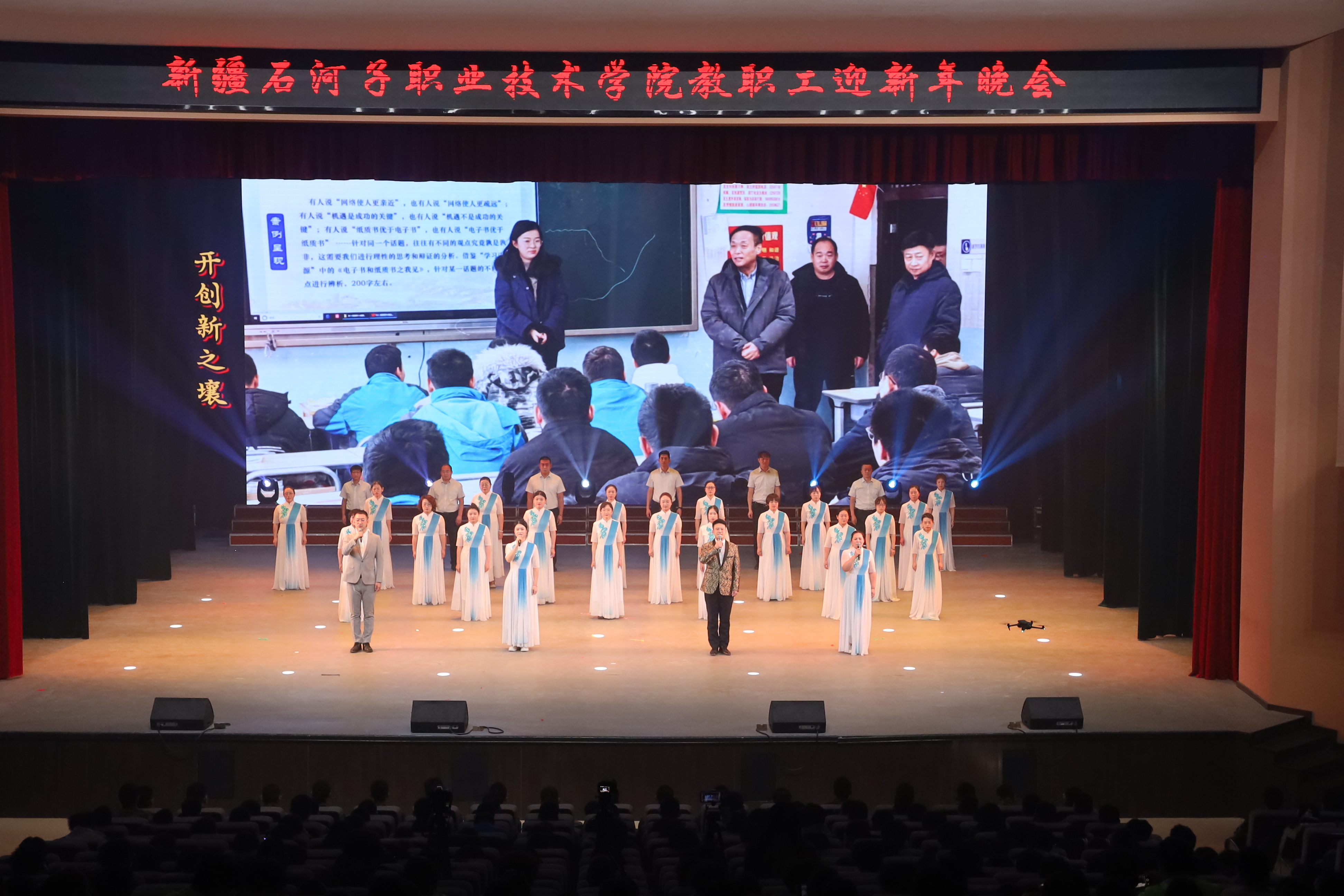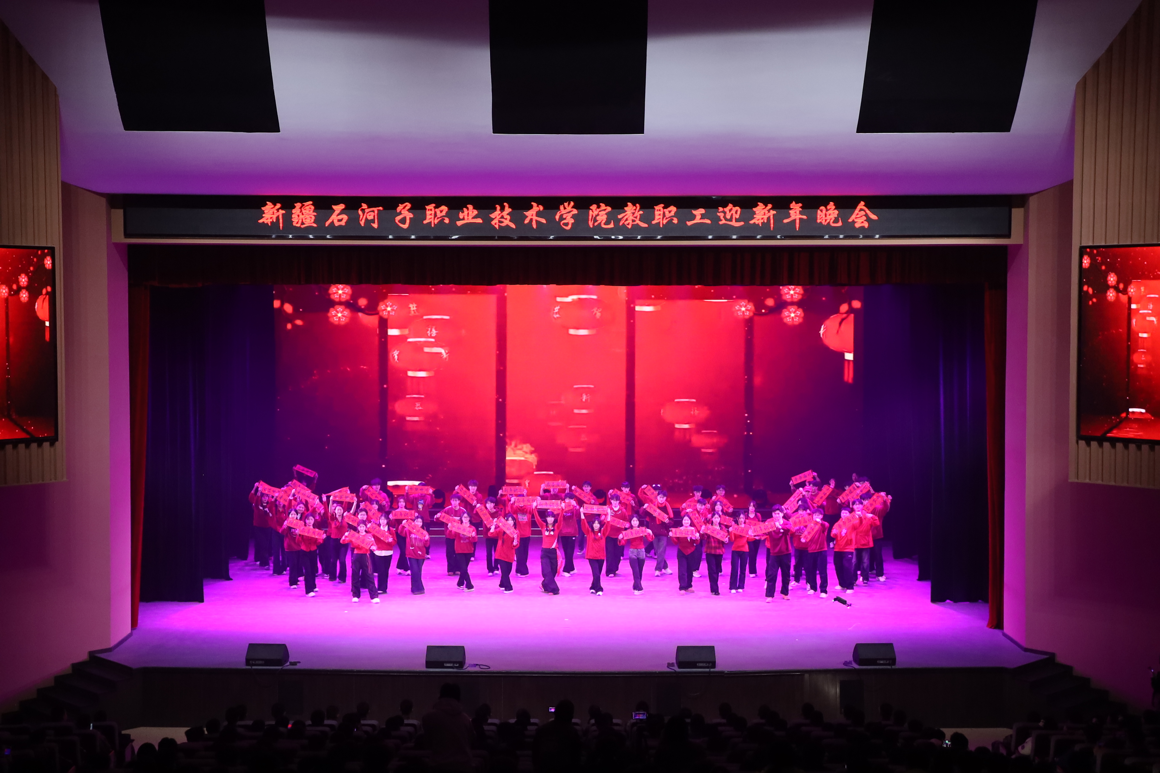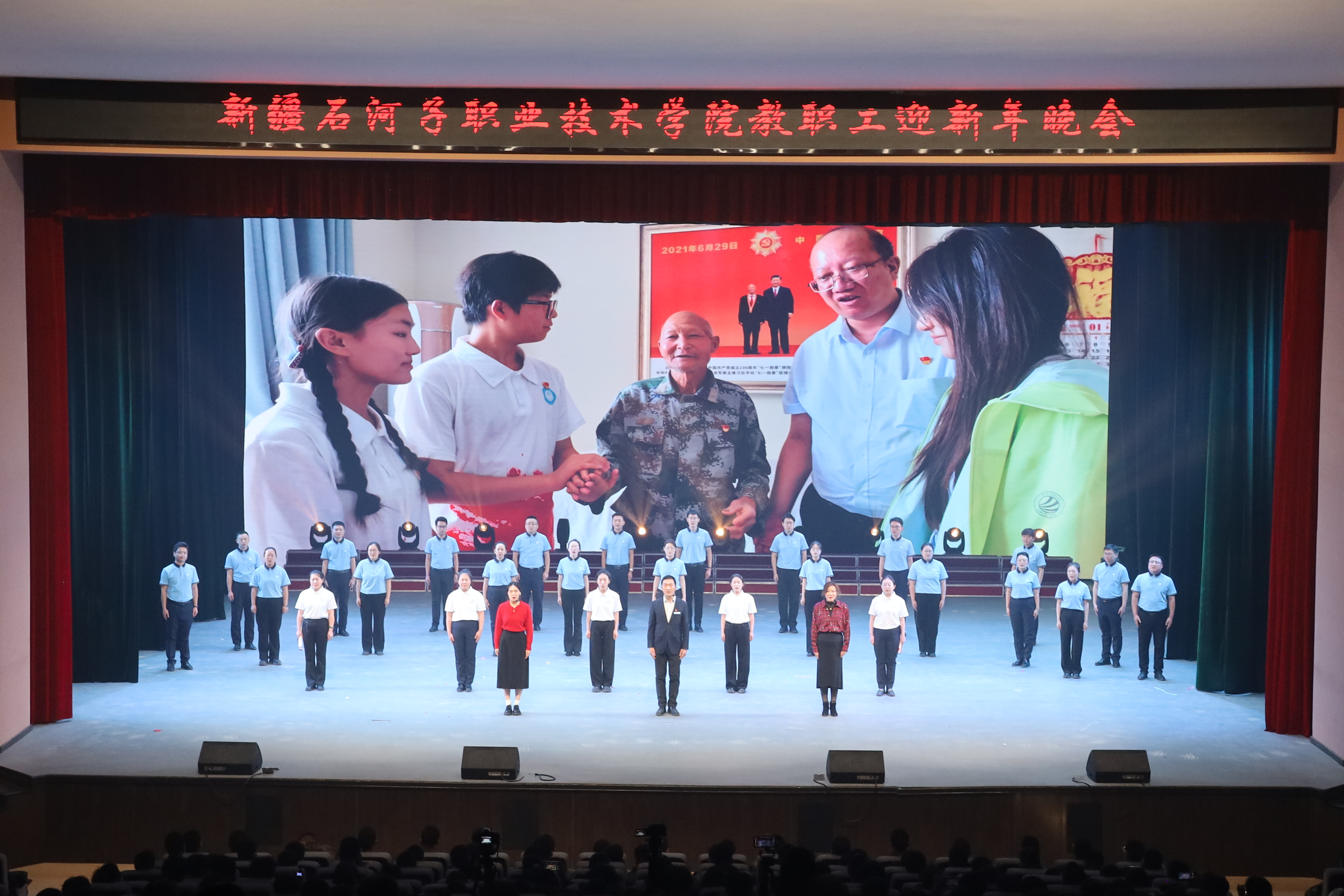 雪域天山迎师友,戈壁教坛庆团圆。2025年12月29日,新疆石河子职业技术学院以“感恩同行匠心路,携手共迎锦绣春”为主题,在学术报告厅举行2025年教职工迎新年晚会。学校党委书记史文革携班子成员,与全体教职工、学生代表1000余人欢聚一堂,共话教育初心,共庆盛世新年。