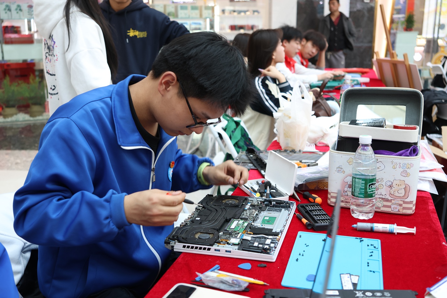 活动现场,来自学校各二级学院及东城街道共建单位的20余个志愿服务展位有序排开。学子们身着红色马甲志愿服,用专业技能与热忱服务,为市民提供电器维修、健康咨询、垃圾分类科普、公益摄影等多元化服务。“同学,这个电热水壶能修吗?”“您放心,交给我们。”家电维修展位前,来自机械电气工程学院的学子专注地为市民检测故障电器;健康咨询区里,现代服务学院的同学们正耐心为老人测量血压,轻声叮嘱春日保健要点;垃圾分类科普展位围满了带着孩子的家长,志愿者们用自制的分类教具,通过游戏模拟的趣味形式播撒环保种子。与此同时,爱心义卖区的多肉盆栽、手工香囊引来市民驻足,书画体验区墨香四溢,公益摄影区快门声声......学子们将实用、贴心、暖心的服务送到群众身边,以实际行动展现新时代石职青年的奉献担当,赢得了现场市民的广泛赞誉。在文艺表演环节,学生们为现场观众们带来精心编排的节目:龙狮社团的同学们率先登场,雄狮踏着鼓点灵动跳跃,瞬间点燃全场热情;大学生艺术团的民族舞者裙摆飞扬,用曼妙舞姿勾勒出多彩中华;武术表演刚劲有力,一招一式尽显武魂铮铮;歌曲《少年中国说》唱出了职教学子的报国之志;朗诵《雷锋精神永发扬》声情并茂,带领观众穿越时空对话榜样;戏腔婉转的《赤伶》在传统雅致中诉说家国大义,引得现场掌声不断。从《火红的萨日朗》的草原热情到《青苹果乐园》的青春律动,十余个节目既有传统韵味,又具时代气息,为市民送上了一场“家门口”的文化大餐。