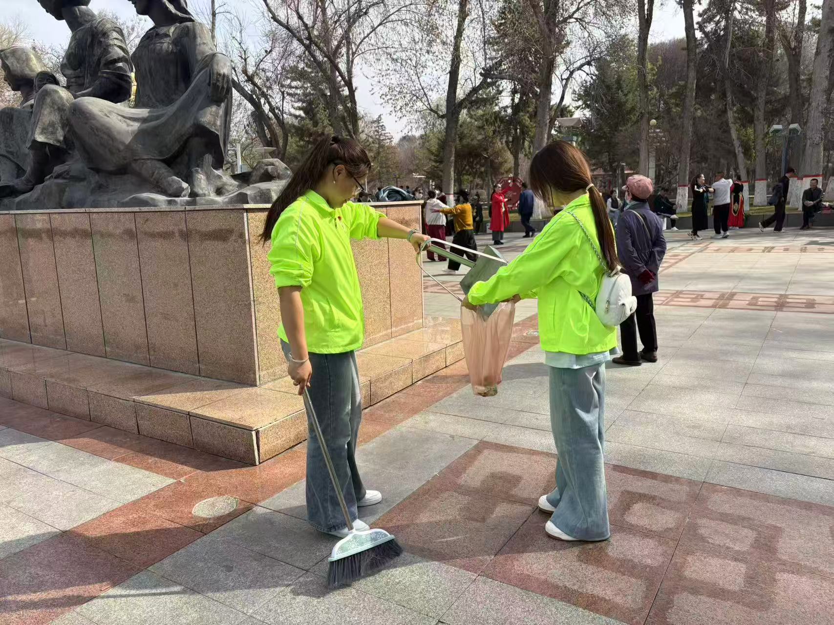 志愿者们在军垦文化广场,手持扫帚、抹布、垃圾袋等工具,认真清扫路面、擦拭宣传栏、清理绿化带杂物,以实际行动守护红色阵地,践行奉献精神与文明祭扫理念,展现了学院师生优良风貌。