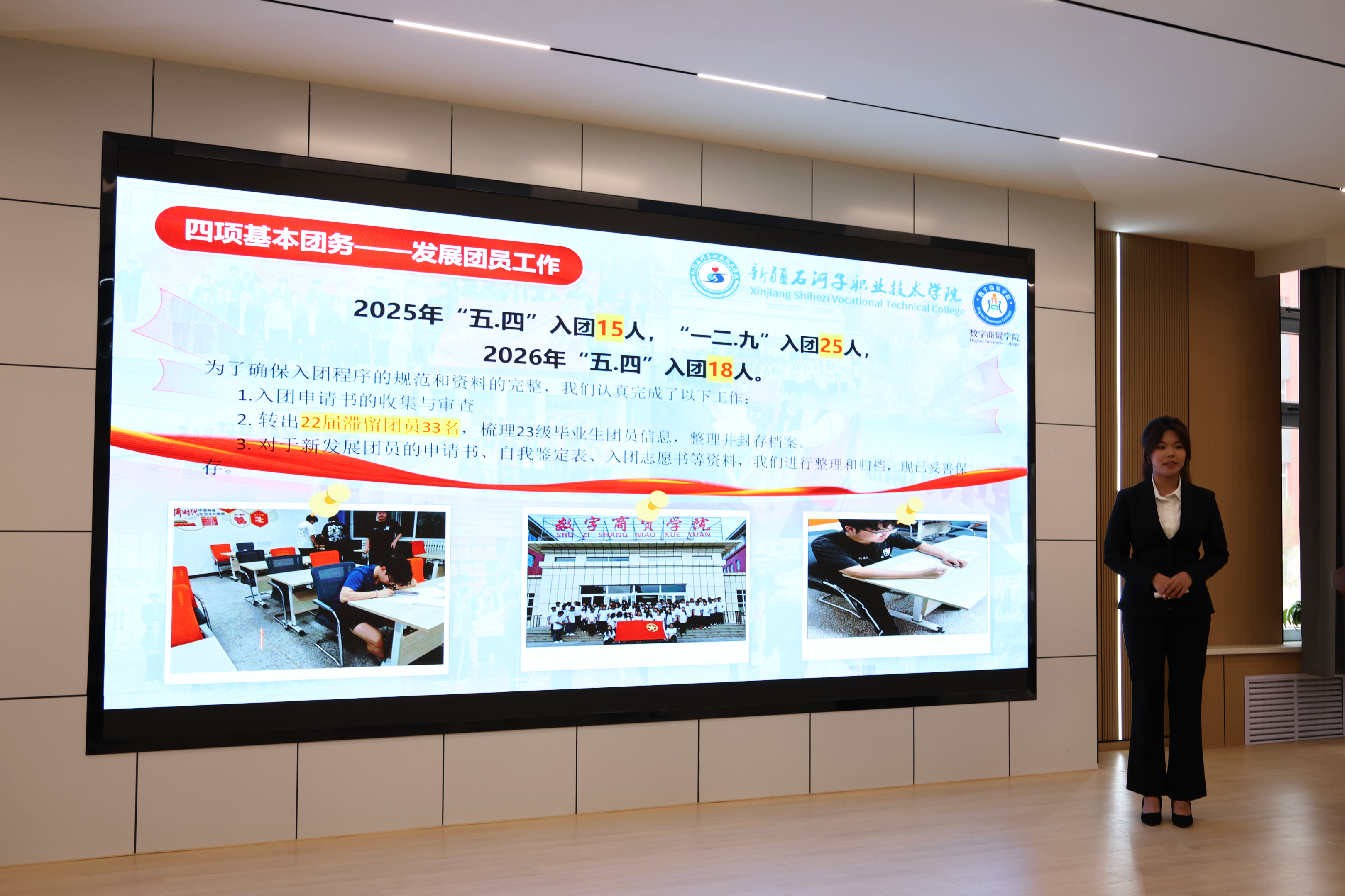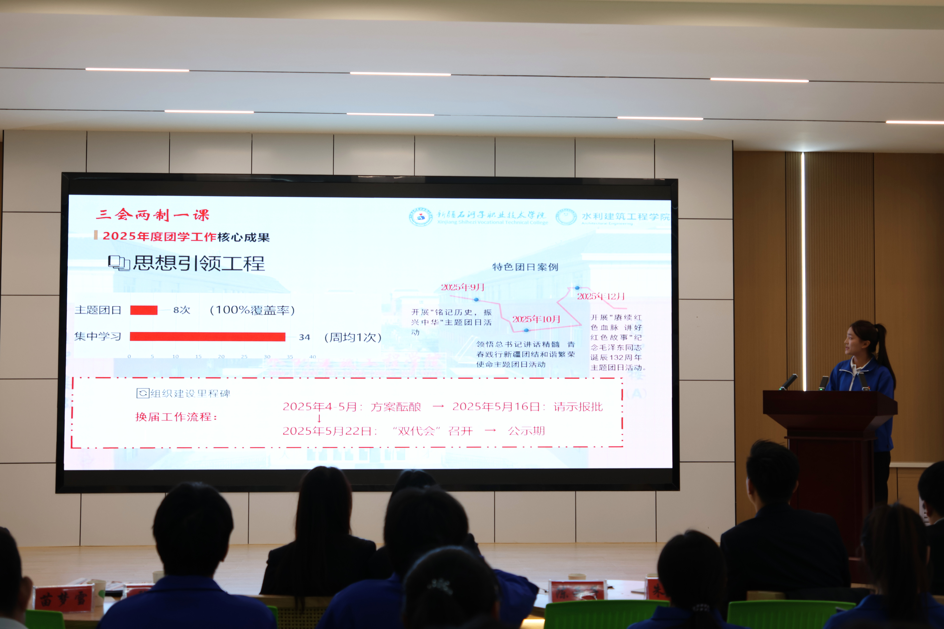 答辩会上,各二级学院团总支负责人结合专业特色和学生实际,围绕思想引领、组织建设、社会实践、志愿服务、第二课堂等重点领域汇报过去一年在引领青年、服务成长方面的成效。一年来,各基层团支部创新理论团日、学习小组、红色实践等形式,强化青年理想信念教育;规范基础团务,推进“智慧团建”,提升组织力;在社会实践与志愿服务方面,组织学生参与“三下乡”“返家乡”、乡村振兴、社区治理、赛会服务等,展现青年担当;第二课堂聚焦综合素质提升,打造了一批具有专业特色的校园文化品牌。