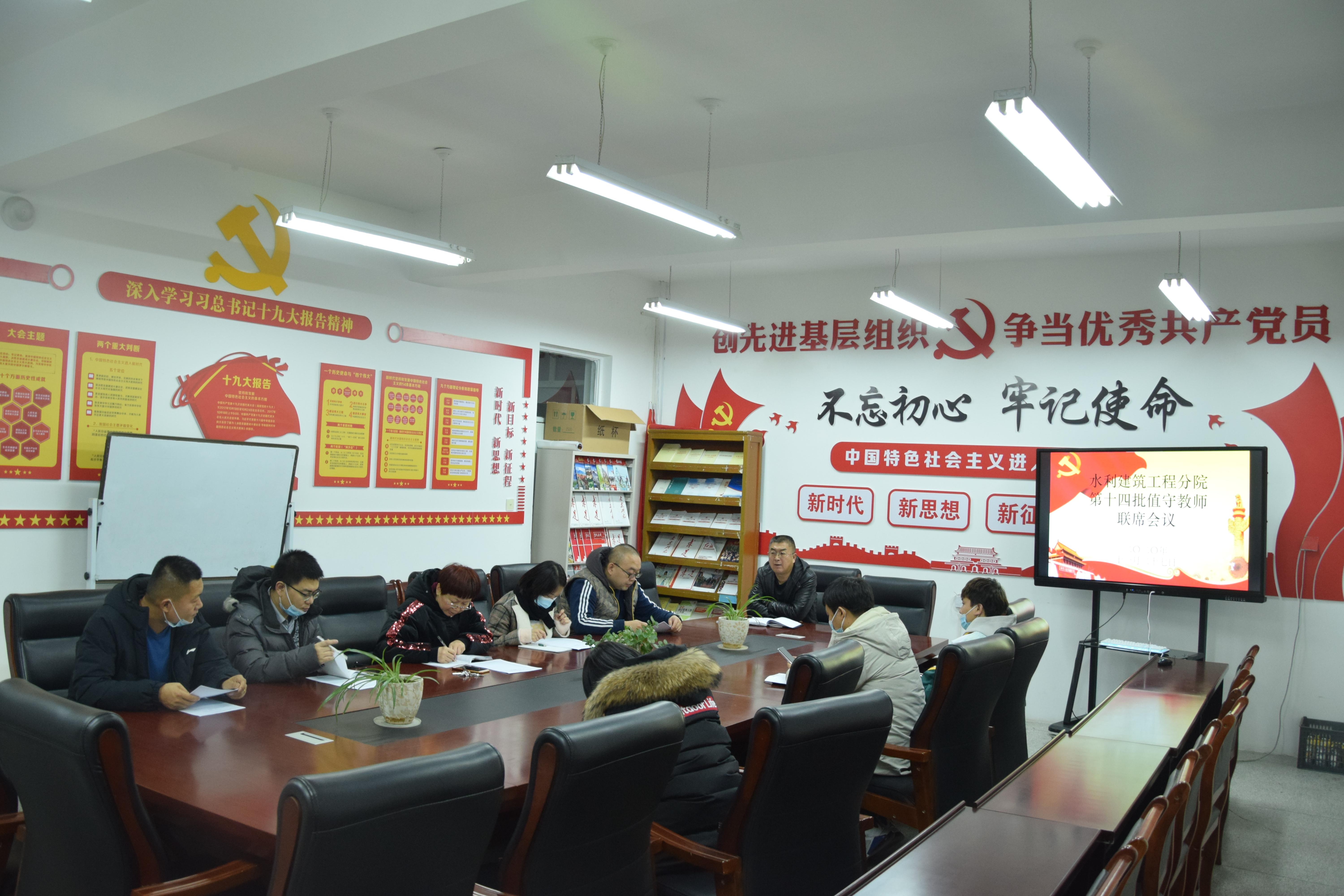 为进一步提高水建分院第14批值守教师的履职能力,全力做好分院教育教学及疫情防控值守工作,2020年11月27日晚21:00,全体值守教师在俞峰书记的召集下,于前楼318参加了第14批值守教师工作会议。此次会议的主要内容是传达疫情防控要求会议精神、督促各教师做好教学、班级管理及值班工作。