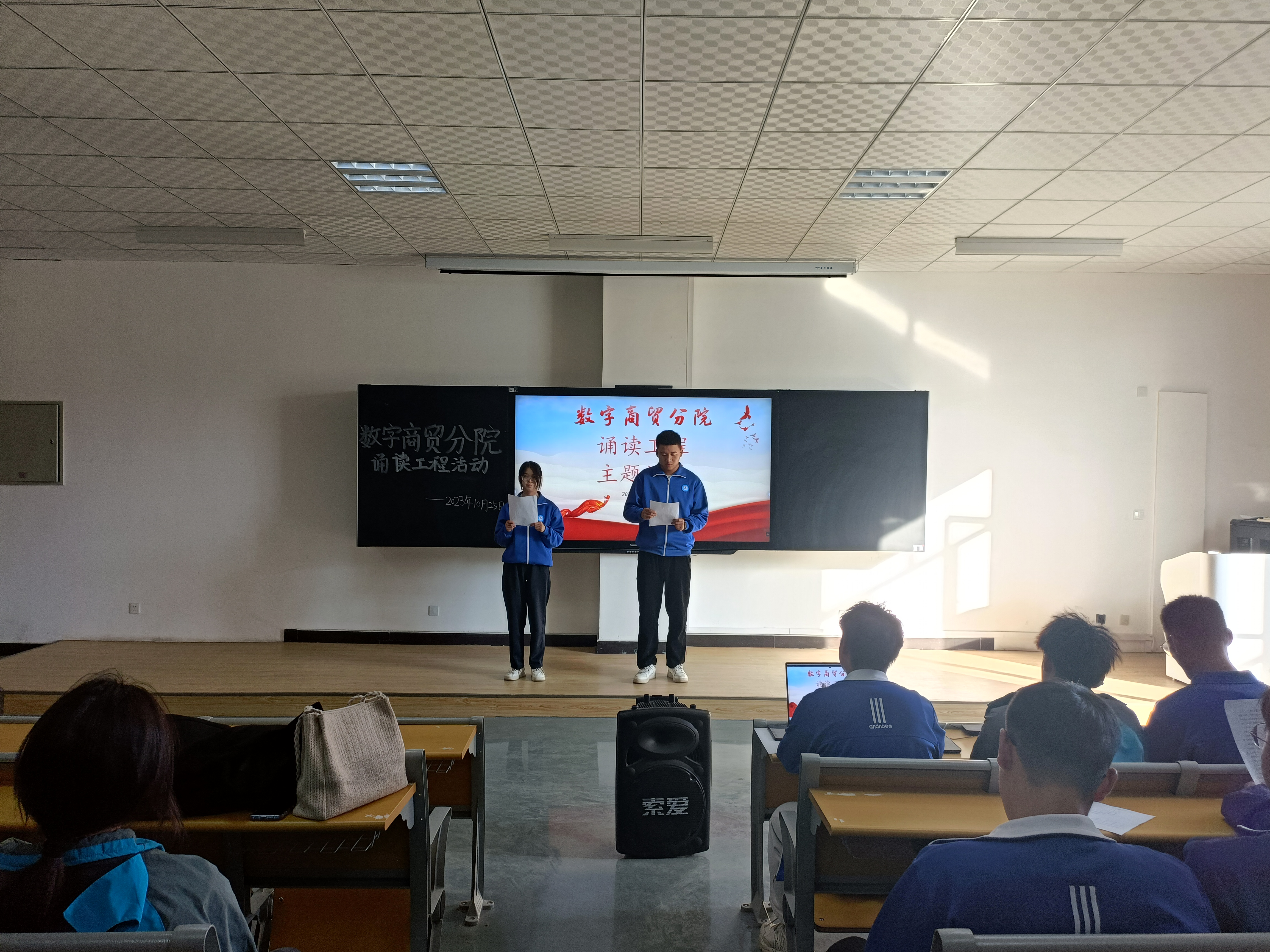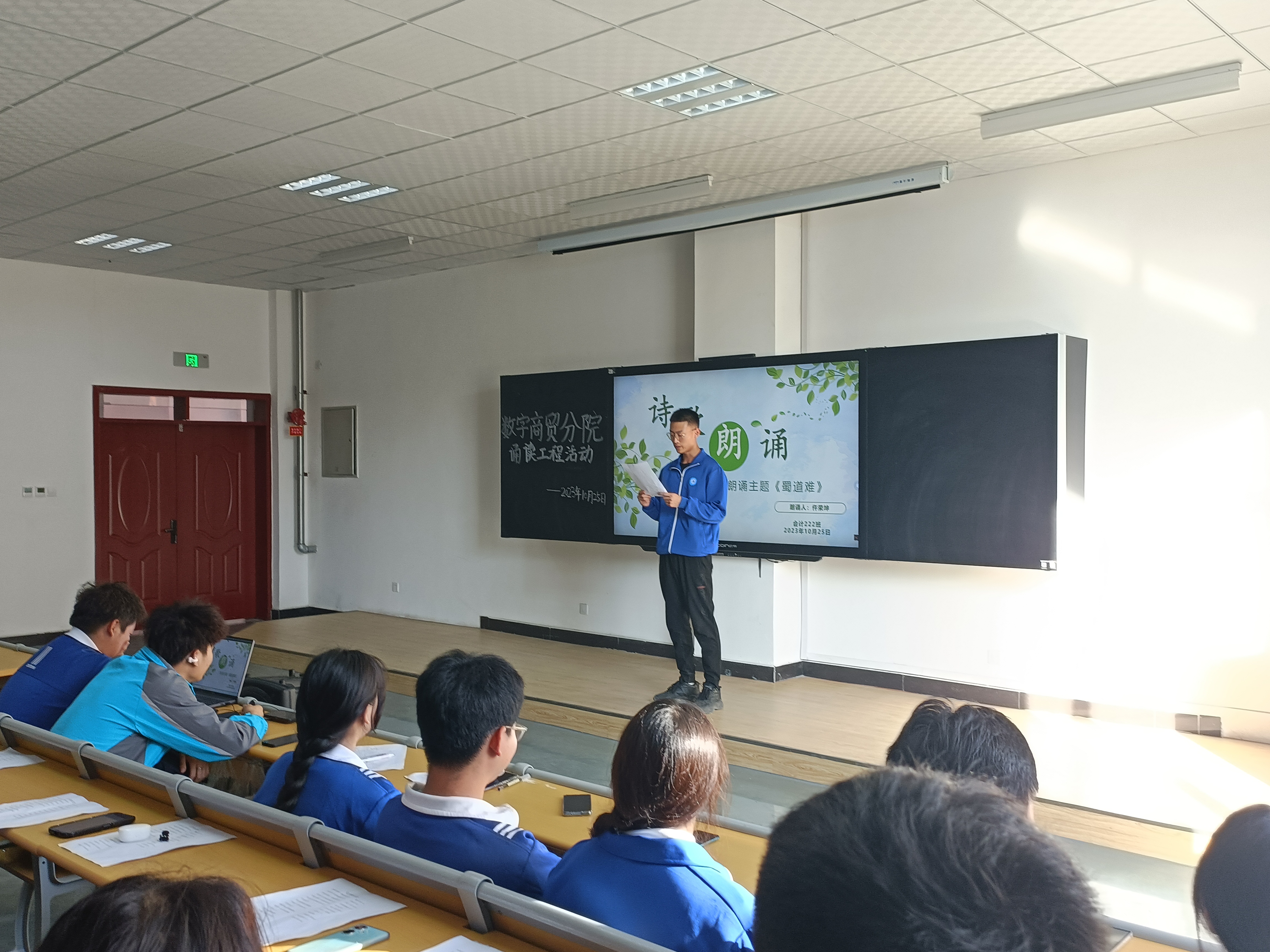 (傅冬 报道)为贯彻落实习近平新时代中国特色社会主义思想和党的二十大精神,落实兵团党委“延续城市文脉、讲好城市故事、突出兵团特色”文化要求,打造“中国诗歌之城”靓丽名片,丰富学院校园文化建设与发展,10月25日下午,新疆石河子职业技术学院数字商贸分院“诵读展风采 青春正当时”诵读工程活动在北附楼阶梯教室101举行。