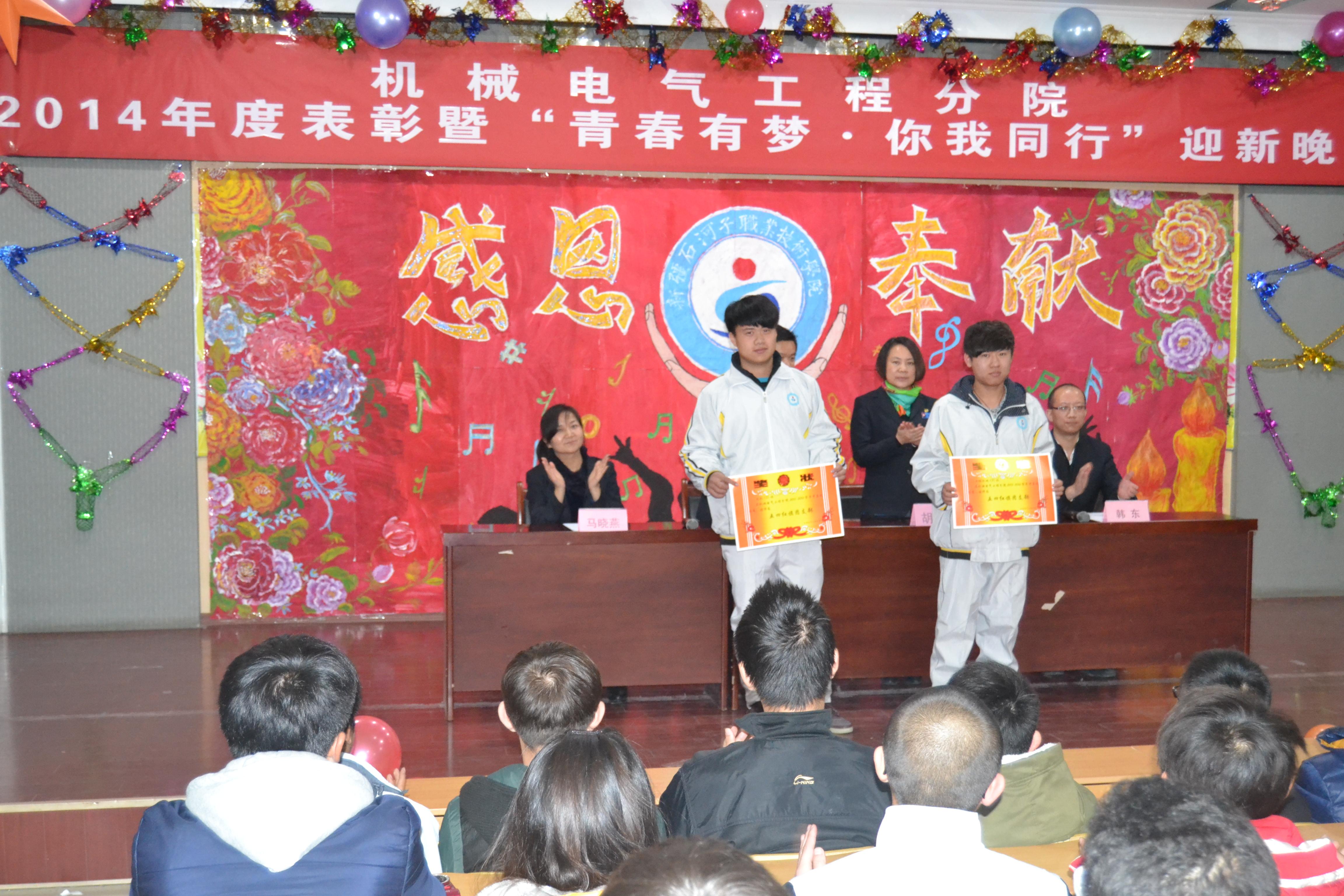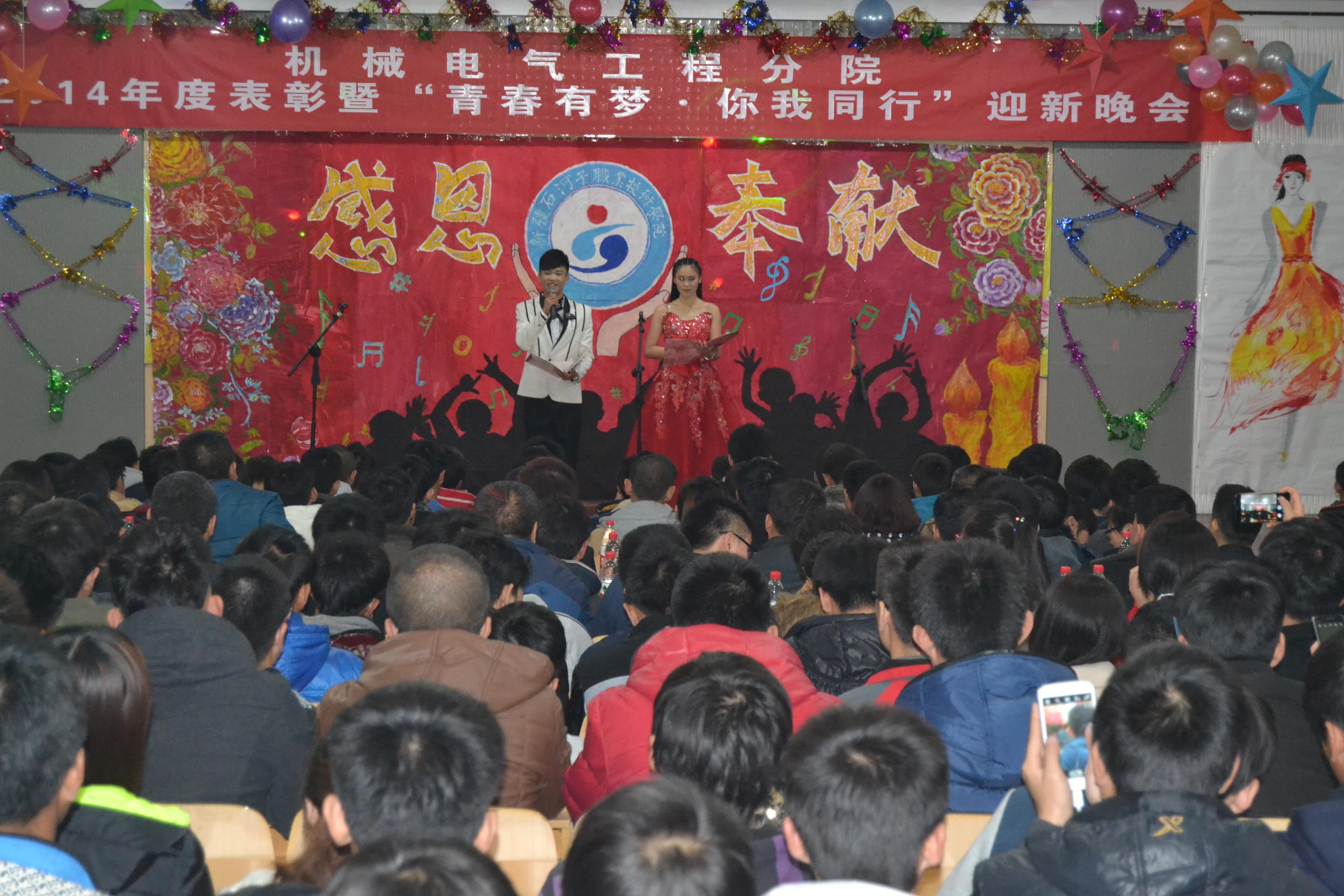2014年11月27日晚8点,由机械电气工程分院主办的2014年度表彰暨 “青春有梦•你我同行”迎新生文艺晚会在我院阶梯教室拉开帷幕。参加此次晚会的领导有:学院纪委书记周赞梅,总务处处长蒋巍,社科部主任王复生,招生办主任宫崇勇,宿管服务中心主任俞峰,水建分院书记李卫,经贸分院院长徐培江,中职分院副院长马木提,信息分院副院长徐通,轻工分院副院长李大鹏,团委马骉和机电分院师生。