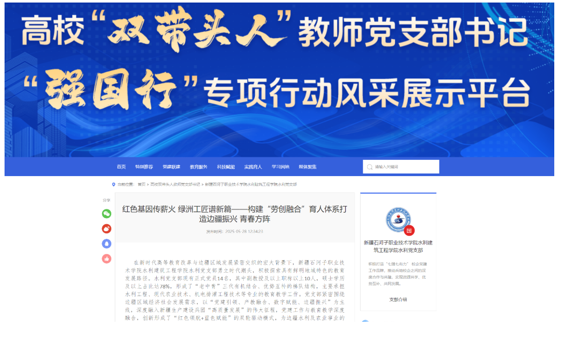 (周俞彤 报道)近日,新疆石河子职业技术学院水利建筑工程学院水利党支部“红色基因传薪火 绿洲工匠谱新篇——构建‘劳创融合’育人体系打造边疆振兴”党建育人案例,成功被全国高校思想政治工作网收录推广,成为边疆职业院校党建与思想政治教育深度融合的典型示范。