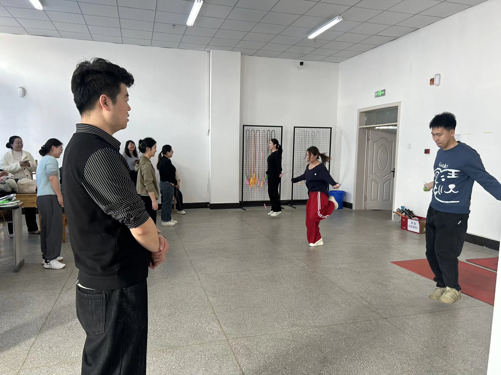 本次趣味健身活动设置一分钟跳绳、乒乓球单打、羽毛球单打和羽毛球双打四个项目。比赛项目兼顾竞技性与趣味性,全体教职工积极参与。比赛过程中,参赛选手严格遵守赛场纪律,展现出良好的体育道德风尚和团队协作精神。跳绳区节奏紧凑,选手动作协调流畅;乒乓球台前对抗激烈,技术运用娴熟;羽毛球场上攻防转换迅速,比赛过程紧张有序。