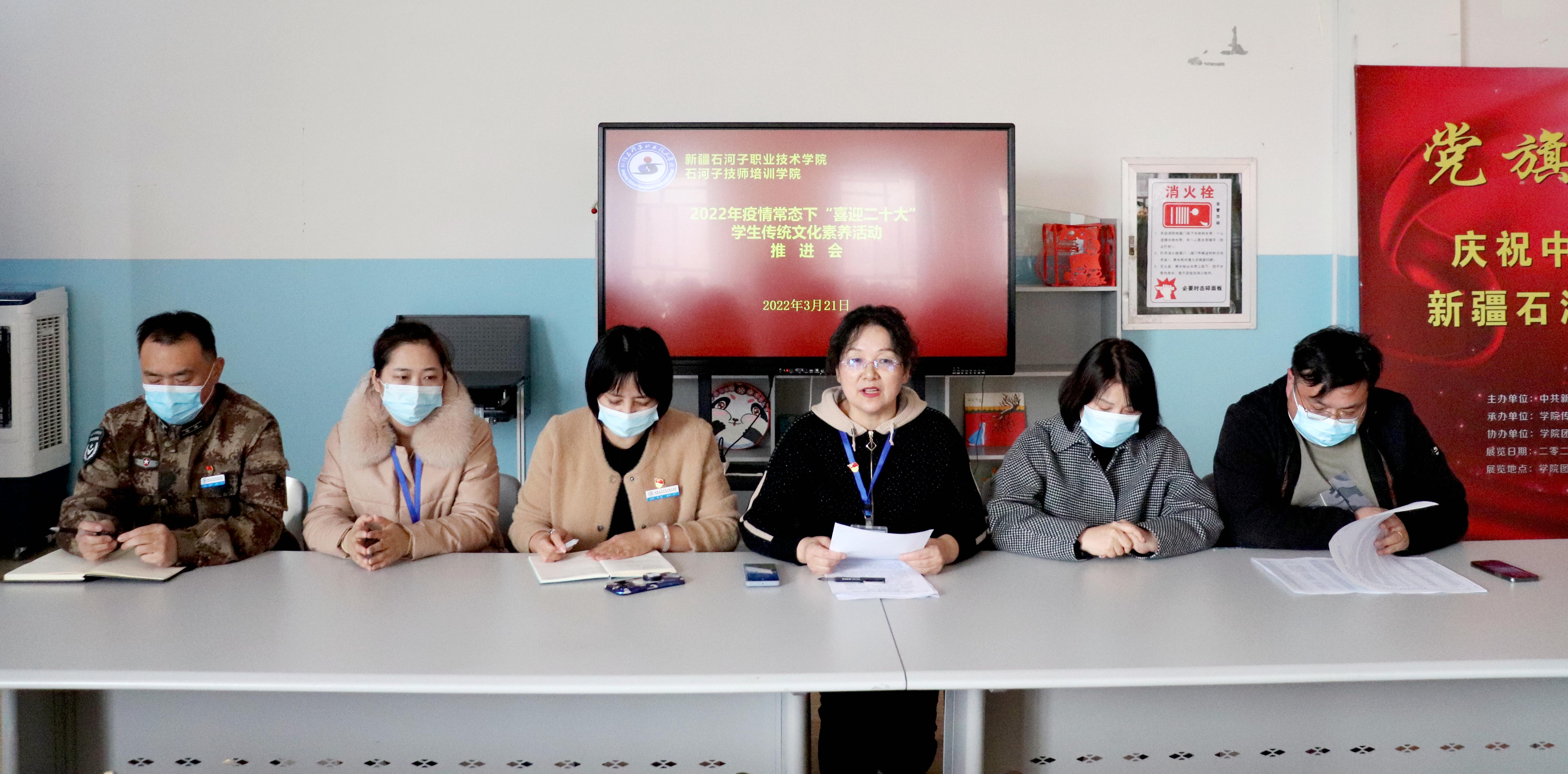 2022年3月21日下午,新疆石河子职业技术学院2022年 “喜迎二十大”优秀传统文化素养活动推进会在图书馆二楼阅览室举行。学生处副处长杨徐飞、思政部主任张敏、社科部主任王需、成教分院院长王国强、士官学院教官张伟,中职分院、图书馆教师及图书馆实践团志愿者,专业老师李婵、丁志伟、傅冬、弓超、思殷波老师及学生120人参加会议,推进会由图书馆馆长陈建红主持。