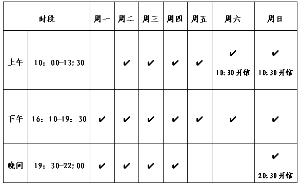 图书馆定于2026年3月4日(周三)开馆,开馆时段如下图表(周一上午闭馆进行内部整理,具体开馆时段请参见下表“✔”标识);寒暑假及法定节假日开闭馆时间将另行通知。