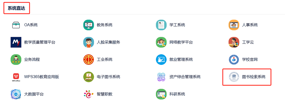 1.登录新疆石河子职业技术学院一网通办,选择系统直达——图书检索系统,点击进入。(该系统本校师生可通过互联网进行访问和使用)