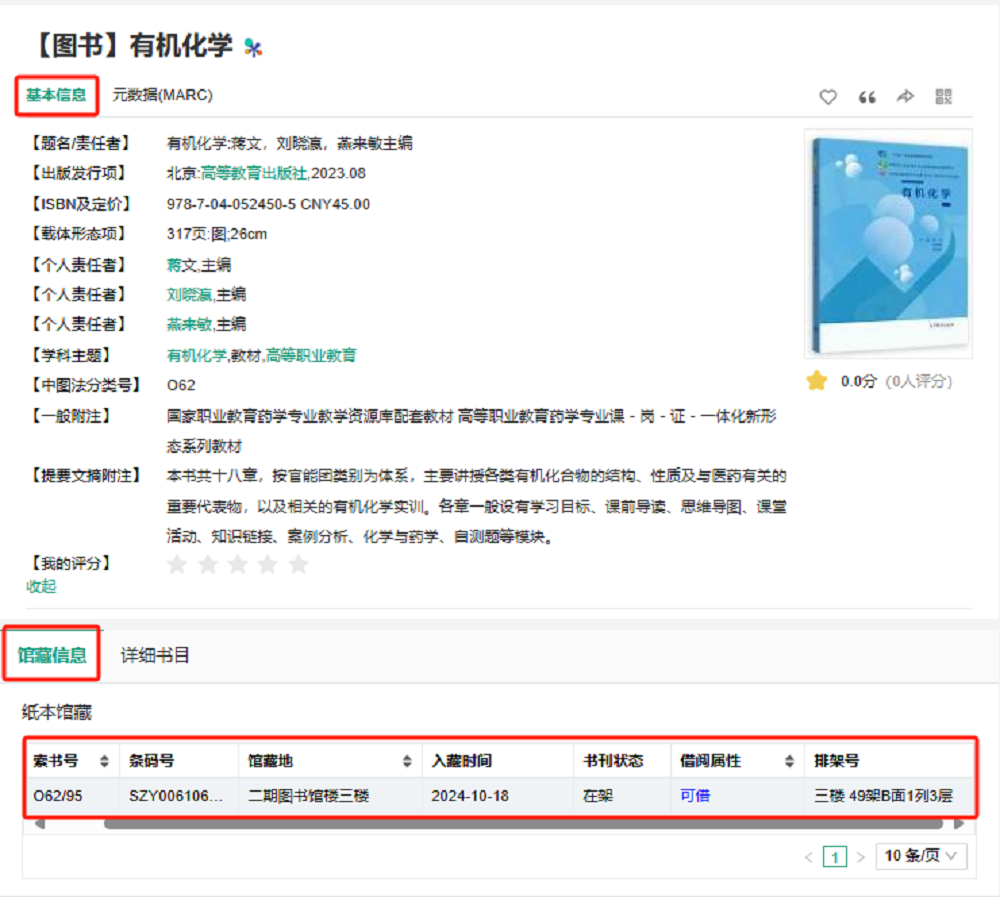 7.在图书详情页面,可查看该图书的基本信息、馆藏信息、图书位置等。