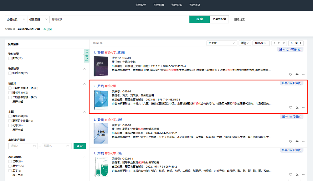 5.可以进行检索条件的限定,以《有机化学》为例,回车键或者点击检索。