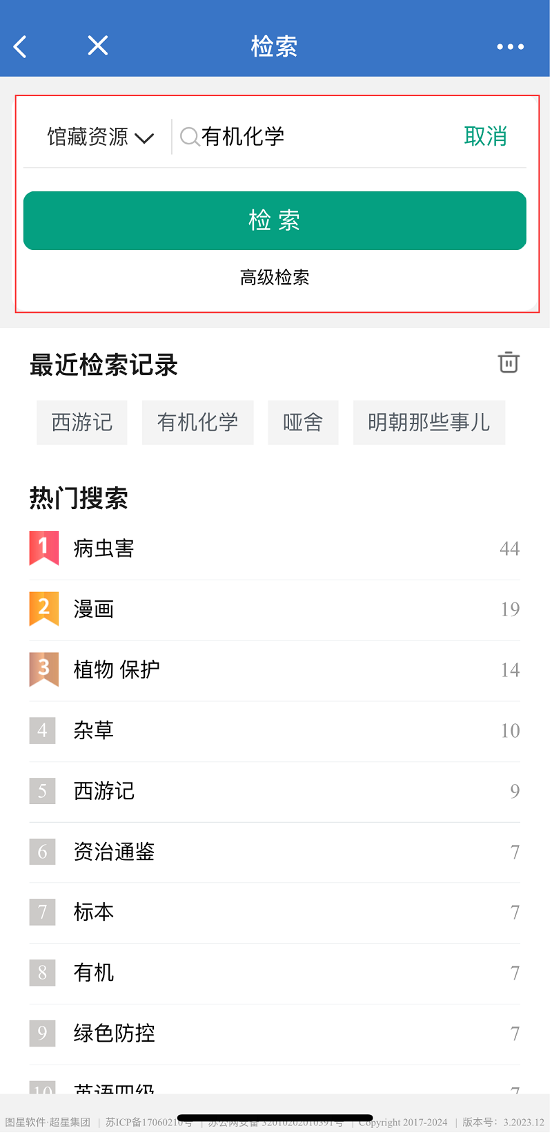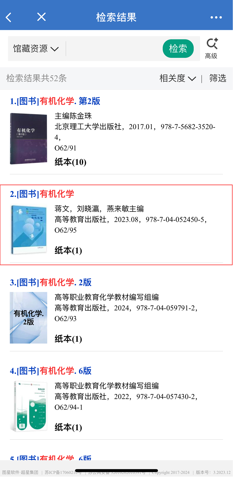3.系统首页可以对资源进行检索、推荐、浏览等。可以进行检索条件的限定,以《有机化学》为例,输入书名后点击检索。
