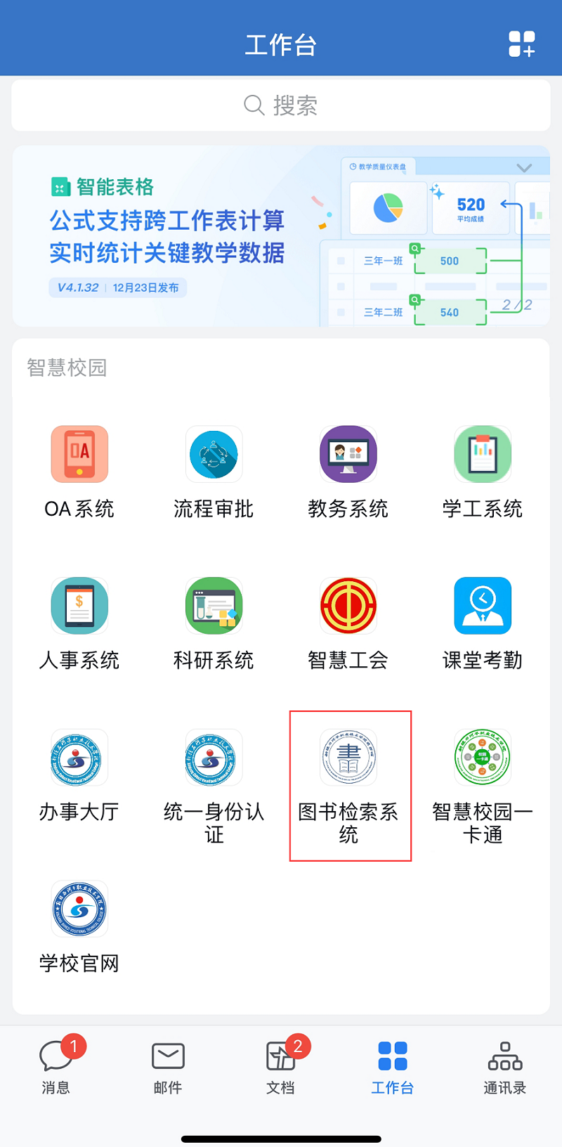 1.打开企业微信,选择工作台——图书检索系统,点击进入。(该系统本校师生可通过互联网进行访问和使用)