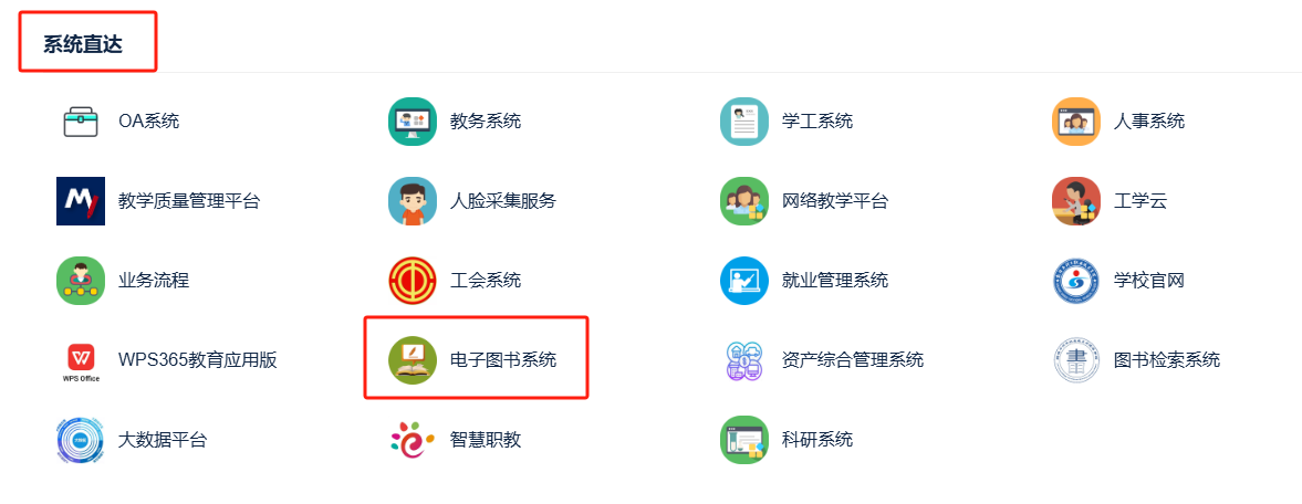 1.登录新疆石河子职业技术学院一网通办,选择系统直达——电子图书系统,点击进入。(该系统仅允许本校师生在校内网络环境下进行访问和使用)