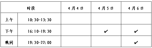 学院图书馆2026年4月4日(星期六)至4月6日(星期一)服务时间安排如下。具体开馆时段请参见下表“✔”标识。