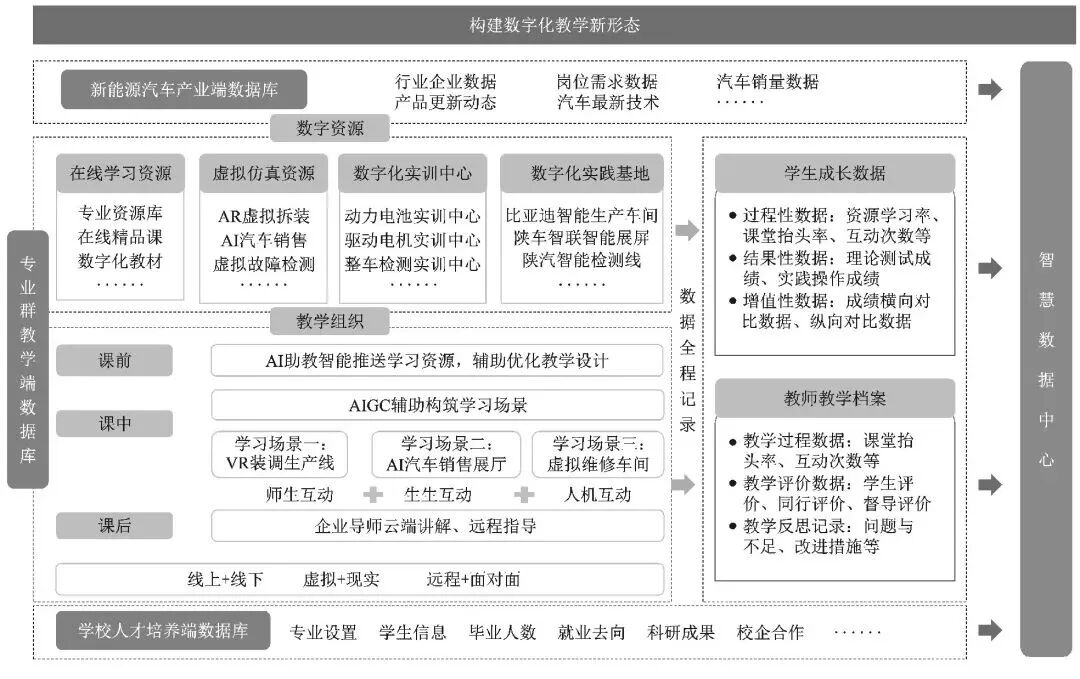 数智技术是网络化、数字化、智能化技术的结合,具有万物互联、聚集不同行业数据的大场景,其应用已扩散至各行业,在应用过程中为行业企业发展提供了海量信息。如图2所示,对接新能源汽车产业智能化改造数字化转型需求,校企共建涵盖产业端数据库、人才培养端数据库、教学端数据库的新能源汽车专业群智慧数据中心,将虚拟现实(Virtual Reality,VR)、人工智能(Artificial Intelligence,AI)等技术融入教学全过程,探索智慧教学新模式,实时采集并动态更新企业岗位需求数据、汽车产销量数据、人才供给数据等,实现校企精准对接、协同育人。