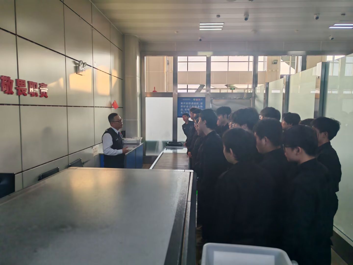 活动通过实地参观、现场讲解与互动交流,为学生搭建了理论与实践结合的学习平台。在西北航空职业技术学校,师生一行先后参观了涵盖民航运输、机务维修、空中乘务等多个专业的实训基地,学生们近距离观察了模拟客舱、值机柜台、航空发动机拆装实训平台等先进教学设施。专业教师结合设备功能与岗位实际,详细讲解了各民航岗位的工作内容、技能要求及行业规范,使学生对民航行业的系统性、专业性和规范性有了更加深入地理解。随后,师生们前往石河子花园机场,了解安检岗位的工作流程与操作规范。安检站站长郎旭平向学生们演示了安全检查、行李X光机判图等安检岗位的核心技能,并讲解了岗位职责、安全规范及职业发展路径。俞峰书记鼓励学生尽快明确自身未来的职业发展方向,更有针对性地投入专业学习。