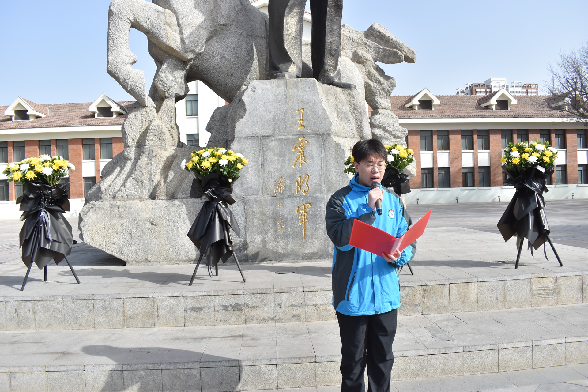 军垦文化广场松柏苍翠,红旗招展。随着庄严的国歌声响起,全体师生肃立注目,深切缅怀为边疆建设奉献终身的革命先烈。由军士生组成的仪仗队迈着整齐的步伐,向革命英烈纪念碑敬献花篮,朵朵盛开的菊花寄托着新时代青年对先辈的无限追思。全体师生垂首默哀一分钟,在静默中表达着自己对革命先烈的缅怀与崇敬。青马班学员代表分别通过讲述《一只碗的故事》《老兵的故事》革命先烈故事,向现场师生展现了老一辈军垦人用青春和血汗换来边疆发展的光辉缩影。“我志愿加入中国共产主义青年团...”在团员代表带领下,全体团员高举右拳重温入团誓词,表达青年学子报效祖国的坚定决心。