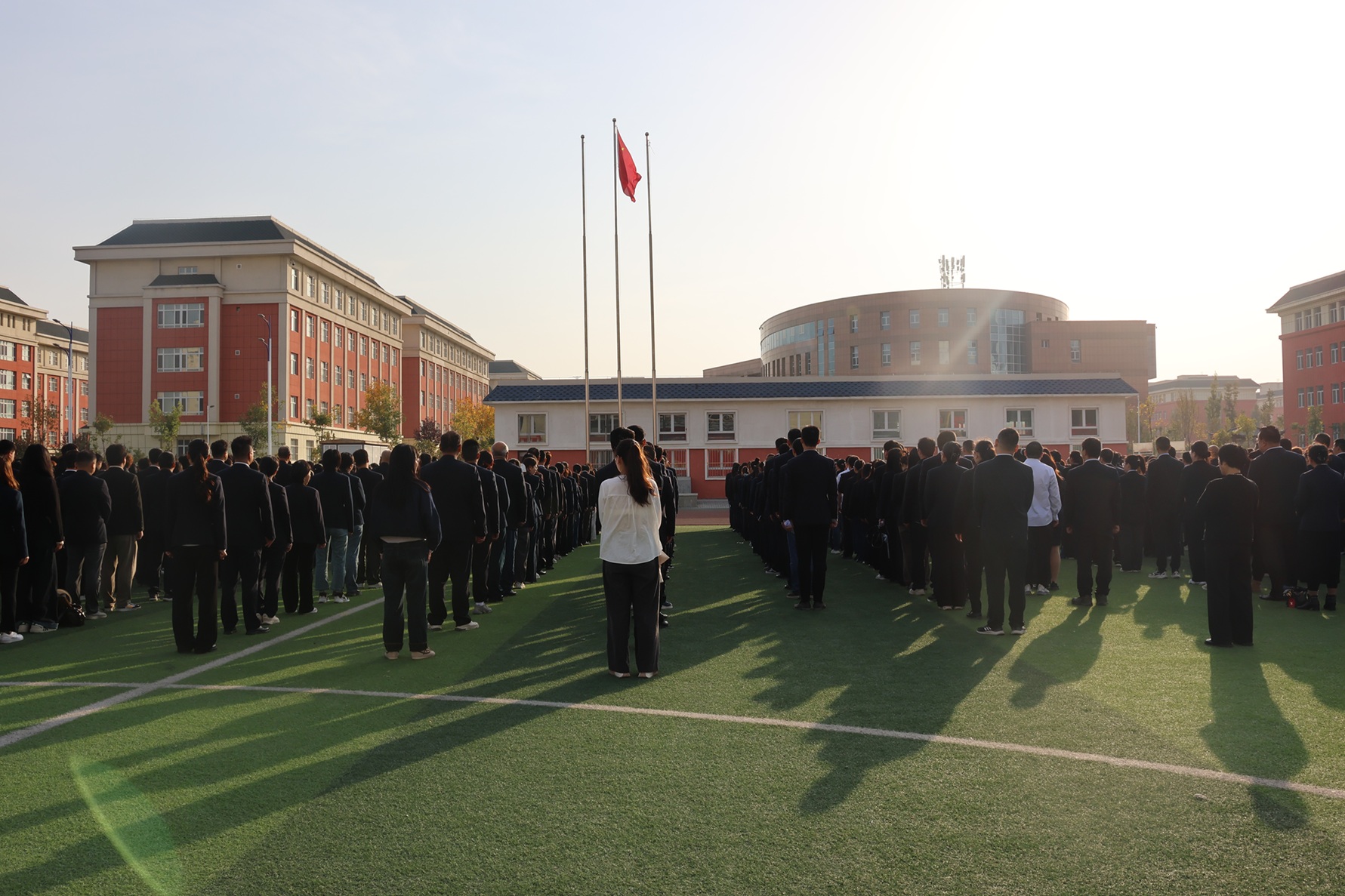 10月1日早上,全体教职工及留校学生齐聚学院二期操场,举行庄严的升旗仪式。“齐步走!”随着一声响亮的口令,英姿飒爽的国旗班成员迈着铿锵有力、整齐划一的步伐,护卫着鲜艳的五星红旗,昂首走向升旗台。他们的眼神坚毅,身姿挺拔,每一步都踏出了新时代青年的昂扬斗志,彰显着对祖国的无限忠诚。“起来!不愿做奴隶的人们……”当雄壮激昂的《义勇军进行曲》响起,五星红旗迎风展开,冉冉升起,师生将目光聚焦于那抹不断攀升的鲜红,心中涌动着对祖国母亲的无限崇敬与热爱。