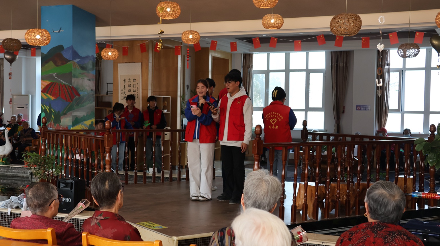 活动现场,同学们为老人们带来了精心准备的文艺节目。活力四射的集体舞《向快乐出发》一开场就点燃现场气氛,将青年学子的蓬勃朝气展现得淋漓尽致;刚劲有力的《擒敌拳》表演,一招一式虎虎生风,赢得了老人们的阵阵掌声;随后,同学们唱响《祖国不会忘记》《没有共产党就没有新中国》《歌唱祖国》,嘹亮歌声里满是对祖国母亲的深沉热爱与美好祝愿,熟悉旋律更唤起了在场所有人心中的家国情怀。