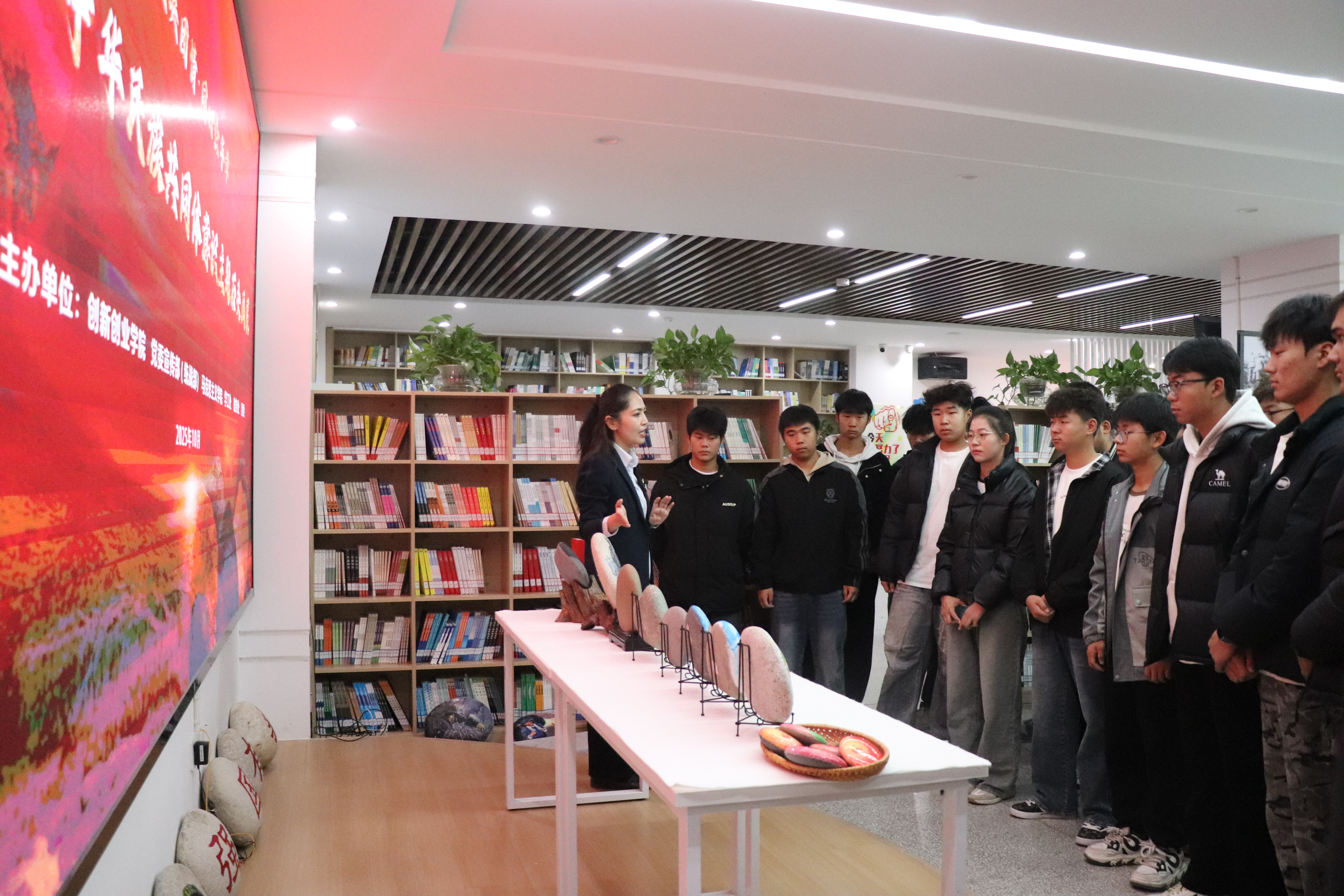 10月18日,展览现场同步开展沉浸式思政实践课——第六期青年马克思主义者培养班100名学员齐聚展厅,以石为媒、以艺为桥,在历史与艺术的对话中重温峥嵘岁月。学校团委负责人黎丽、教师苗梦雪结合石河子变迁主线,通过石头画背后的真实故事,将抽象的兵团精神具象化。党委书记史文革现场与学员交流,寄语大家以观展为新起点,将精神力量转化为成长动力,为兵团发展与学校建设贡献青春力量。