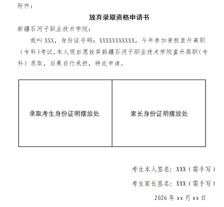 提交一张放弃录取资格申请书,申请书须有考生本人及考生家长身份原件(复印件或截图等均视为无效),落款处需手写考生本人姓名及家长姓名,详见下方模板(附件)。申请书需拍照或扫描成电子版,于2026年4月25日17点前发送到我校招生办邮箱54962933@qq.com。发送的邮件名称必须是“XXX考生直升专放弃录取申请书”,否则一律视为无效邮件。