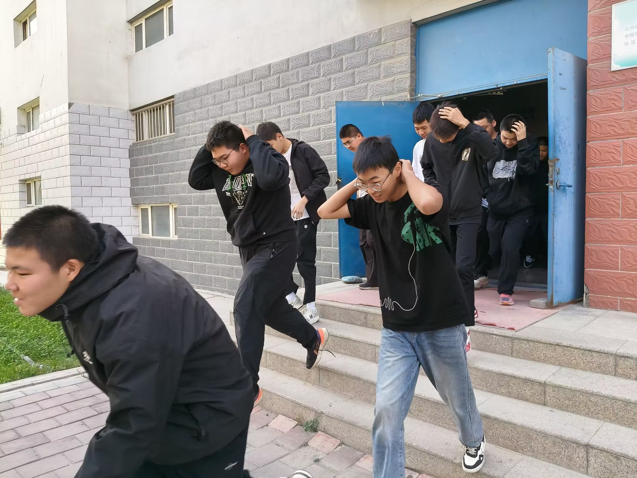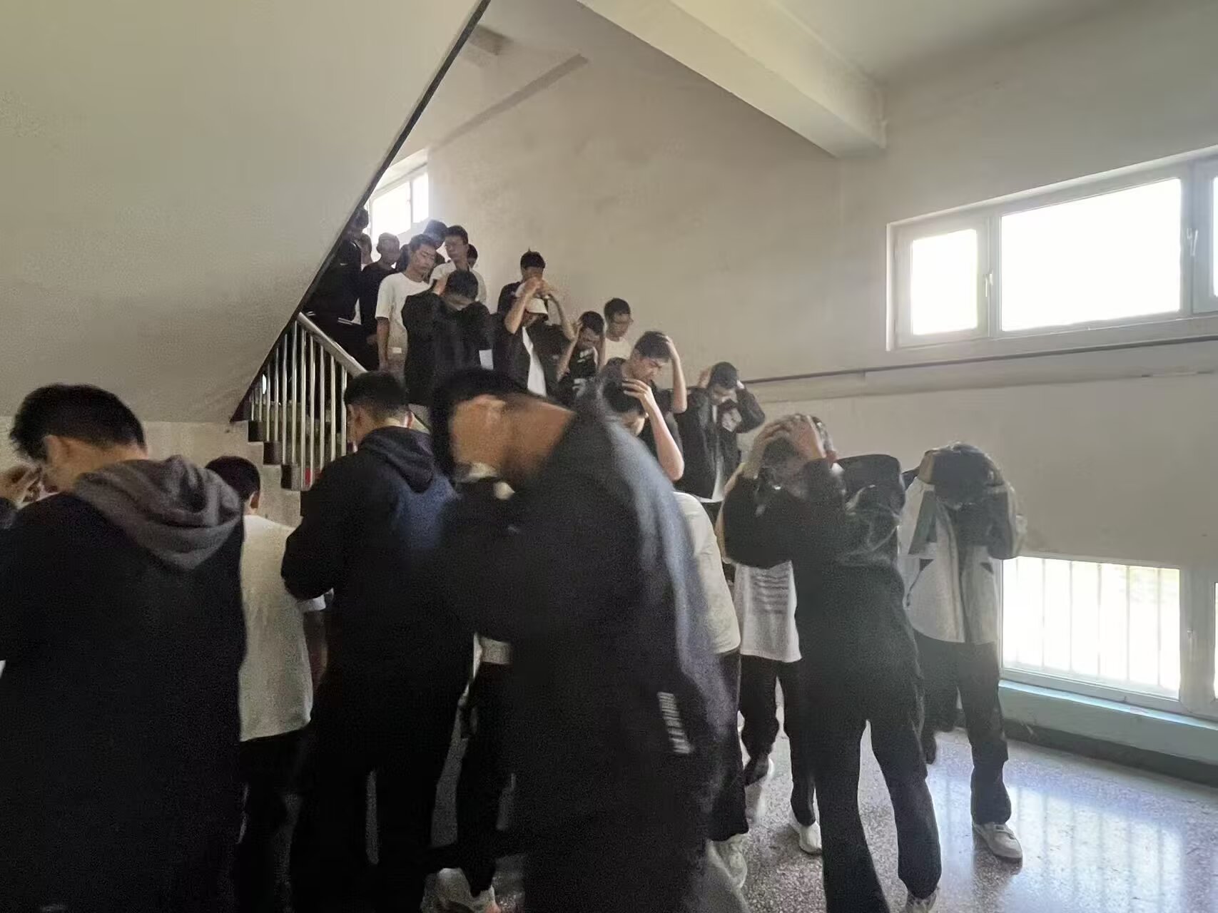 演练前,学院高度重视,通过主题班会等形式,向新生普及防震避震基础知识与疏散流程,着重强调“先避险、后疏散”的核心原则,为演练的顺利开展筑牢基础。当日上午,师市防空三声鸣笛响起,短暂静默后,演练正式拉开帷幕。教室内,新生们反应迅速,立刻双手护头、屈膝下蹲,有序躲至课桌下方等安全区域,最大程度避免头部、身体暴露在危险之中;“避险阶段”结束后,在班主任与学生干部的引导下,各班新生保持“弯腰、护头、快速”的姿势,沿着指定疏散路线向汇智楼前临时集结点有序撤离。整个过程中,同学们安静有序,不推挤、不慌乱,抵达集结点后迅速以班级为单位列队,各班班长第一时间清点人数并向学管老师汇报。最终,全体新生安全抵达篮球场指定区域,实现“零滞留、零意外”,演练疏散环节高效完成。